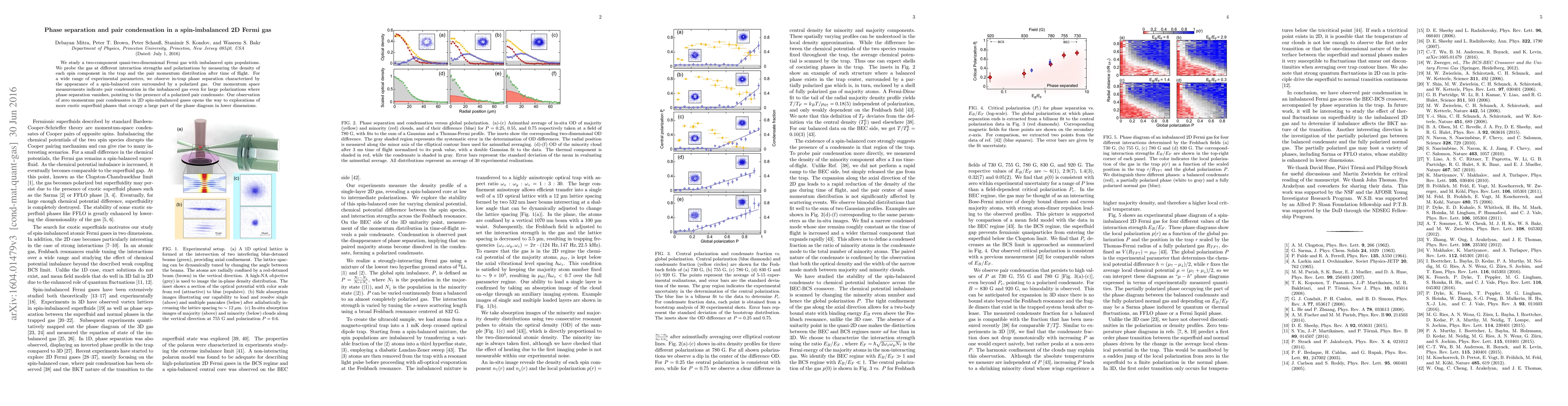 The study examines a two-component quasi-two-dimensional Fermi gas with imbalanced spin populations, probing it at various interaction strengths and polarizations. Density of each spin component in the trap and pair momentum distribution after time of flight are measured to observe phase separation and pair condensation.