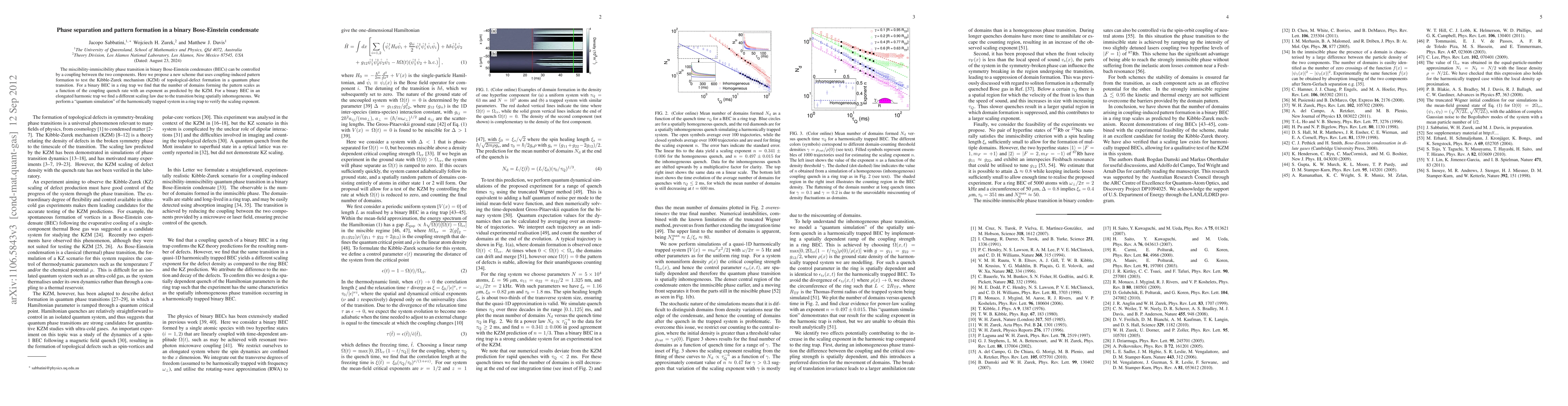 The paper presents a detailed analysis of phase separation and pattern formation in binary BECs, proposing a novel scheme for testing the Kibble-Zurek mechanism using coupling-induced pattern formation, and verifying scaling laws in both ring and harmonically trapped systems.