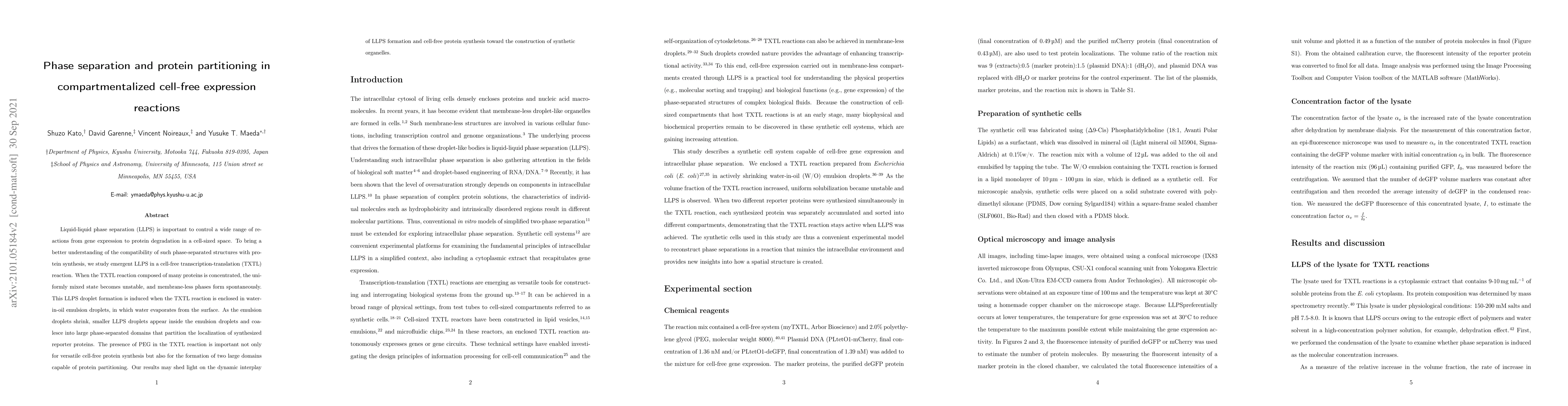 This study explores how liquid-liquid phase separation (LLPS) influences protein partitioning in cell-free transcription-translation reactions. It finds that concentrated TXTL reactions form membrane-less LLPS droplets, which partition synthesized proteins, with PEG playing a crucial role in domain formation and protein synthesis.