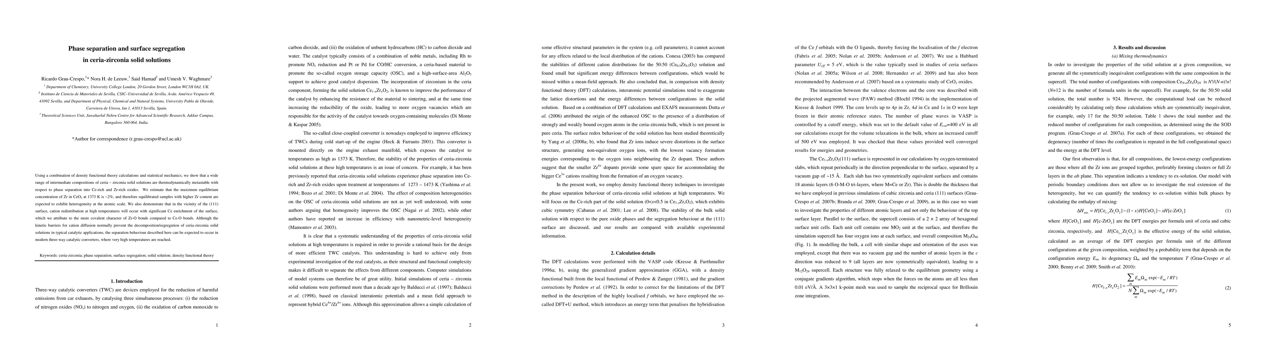 Using a combination of density functional theory calculations and statistical mechanics, we show that a wide range of intermediate compositions of ceria - zirconia solid solutions are thermodynamically metastable with respect to phase separation into Ce-rich and Zr-rich oxides. We estimate that the maximum equilibrium concentration of Zr in CeO2 at 1373 K is ~2%, and therefore equilibrated samples with higher Zr content are expected to exhibit heterogeneity at the atomic scale. We also demonstrate that in the vicinity of the (111) surface, cation redistribution at high temperatures will occur with significant Ce enrichment of the surface, which we attribute to the more covalent character of Zr-O bonds compared to Ce-O bonds. Although the kinetic barriers for cation diffusion normally prevent the decomposition/segregation of ceria-zirconia solid solutions in typical catalytic applications, the separation behaviour described here can be expected to occur in modern three-way catalytic converters, where very high temperatures are reached.