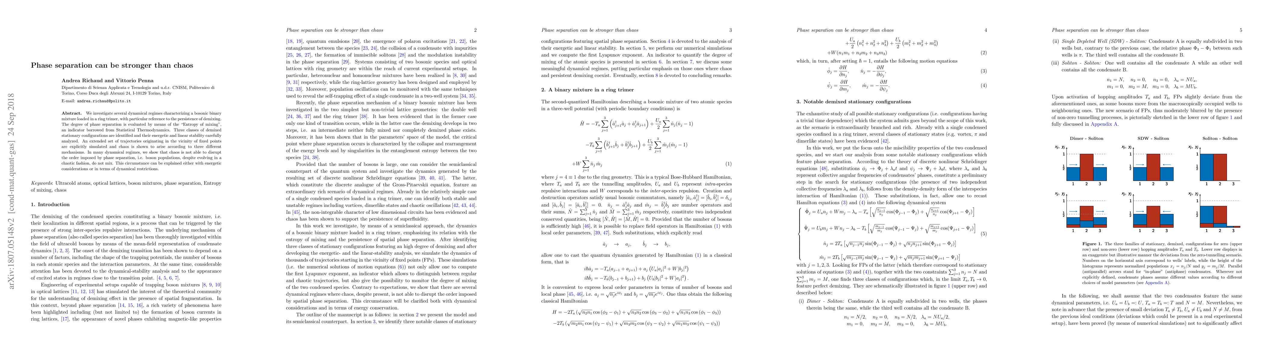We investigate several dynamical regimes characterizing a bosonic binary mixture loaded in a ring trimer, with particular reference to the persistence of demixing. The degree of phase separation is evaluated by means of the "Entropy of mixing", an indicator borrowed from Statistical Thermodynamics. Three classes of demixed stationary configurations are identified and their energetic and linear stability carefully analyzed. An extended set of trajectories originating in the vicinity of fixed points are explicitly simulated and chaos is shown to arise according to three different mechanisms. In many dynamical regimes, we show that chaos is not able to disrupt the order imposed by phase separation, i.e. boson populations, despite evolving in a chaotic fashion, do not mix. This circumstance can be explained either with energetic considerations or in terms of dynamical restrictions.