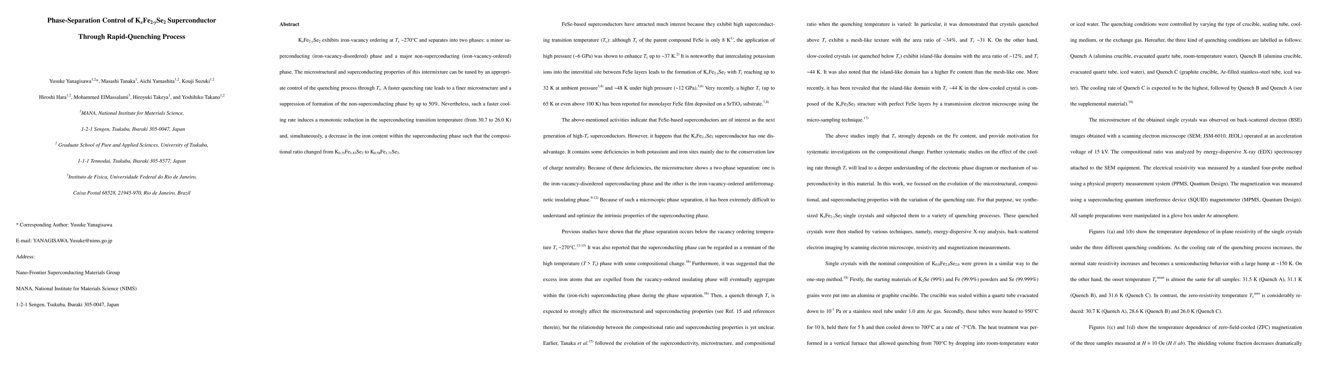 This study investigates how rapid-quenching affects the phase separation and superconducting properties of K$_x$Fe$_{2-y}$Se$_2$. Faster quenching reduces the non-superconducting phase by up to 50% but lowers the superconducting transition temperature and alters the iron content within the superconducting phase.