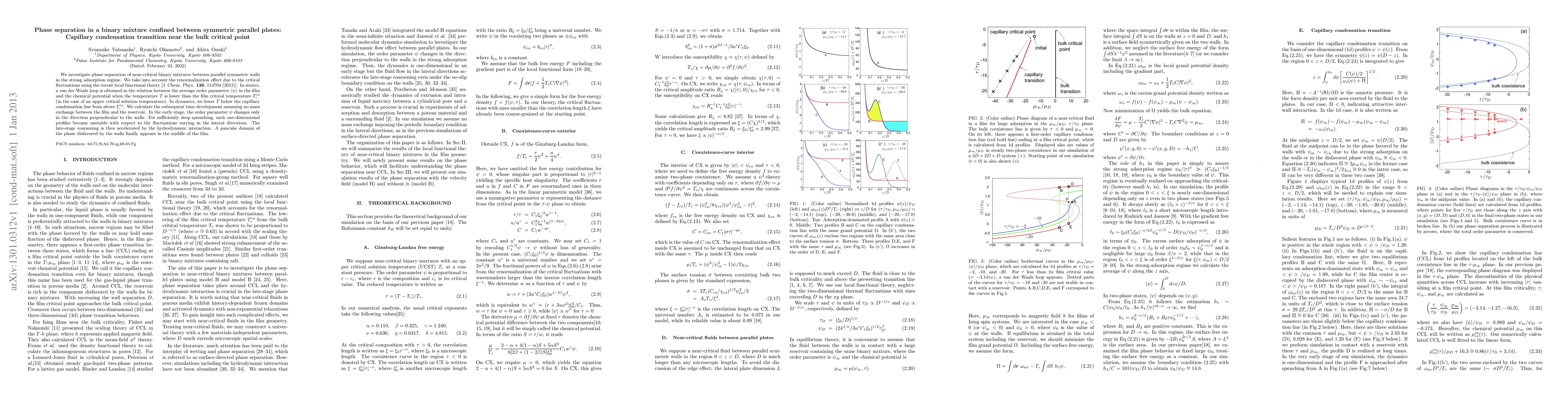 This paper examines phase separation in near-critical binary mixtures confined between parallel plates, focusing on the capillary condensation transition near the bulk critical point. Using local functional theory, it finds that the system undergoes a van der Waals loop in statics and exhibits one-dimensional profile instability followed by hydrodynamically accelerated coarsening in dynamics.