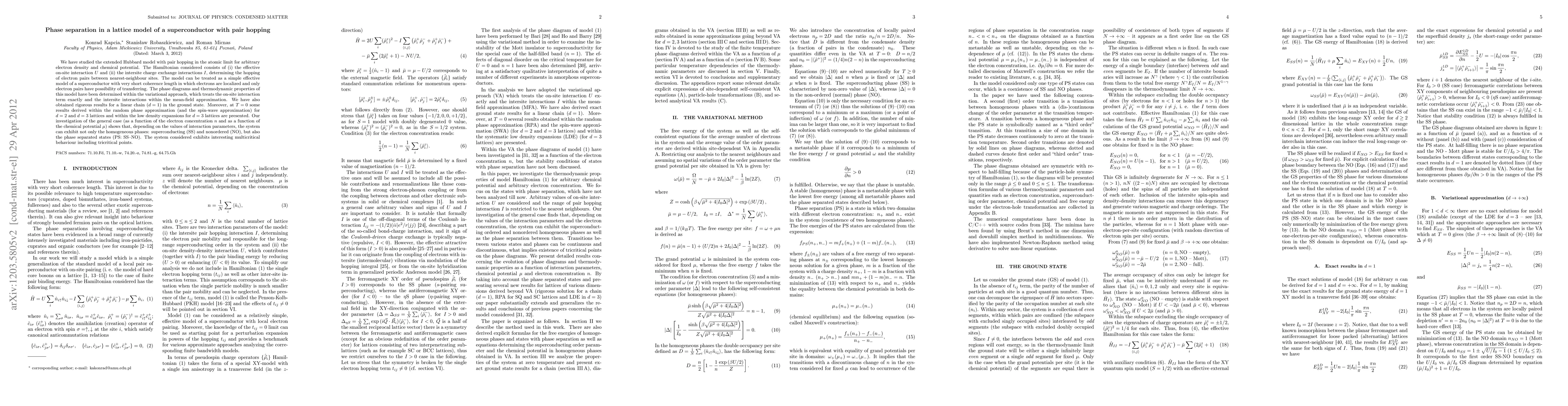We have studied the extended Hubbard model with pair hopping in the atomic limit for arbitrary electron density and chemical potential. The Hamiltonian considered consists of (i) the effective on-site interaction U and (ii) the intersite charge exchange interactions I, determining the hopping of electron pairs between nearest-neighbour sites. The model can be treated as a simple effective model of a superconductor with very short coherence length in which electrons are localized and only electron pairs have possibility of transferring. The phase diagrams and thermodynamic properties of this model have been determined within the variational approach, which treats the on-site interaction term exactly and the intersite interactions within the mean-field approximation. We have also obtained rigorous results for a linear chain (d=1) in the ground state. Moreover, at T=0 some results derived within the random phase approximation (and the spin-wave approximation) for d=2 and d=3 lattices and within the low density expansions for d=3 lattices are presented. Our investigation of the general case (as a function of the electron concentration and as a function of the chemical potential) shows that, depending on the values of interaction parameters, the system can exhibit not only the homogeneous phases: superconducting (SS) and nonordered (NO), but also the phase separated states (PS: SS-NO). The system considered exhibits interesting multicritical behaviour including tricritical points.