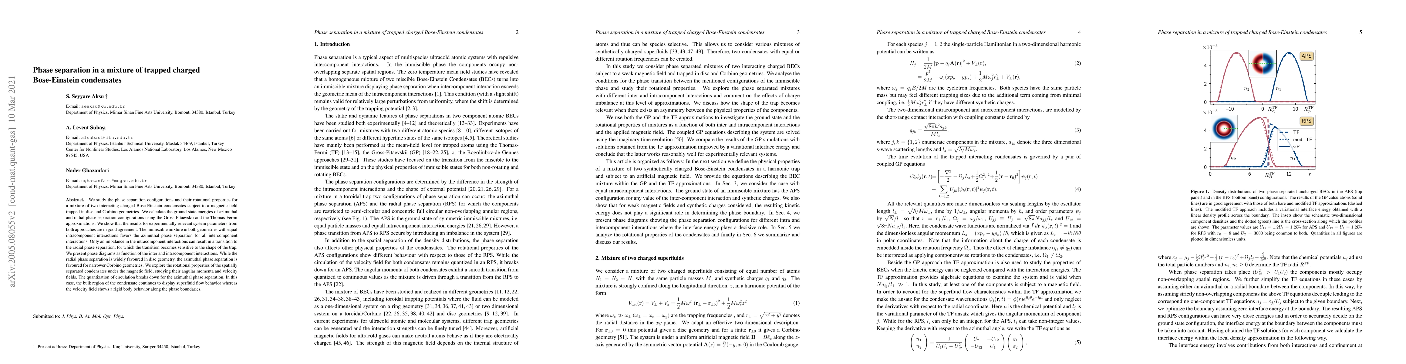 The study uses Gross-Pitaevskii and Thomas-Fermi approximations to calculate ground state energies of azimuthal and radial phase separation configurations in a mixture of trapped charged Bose-Einstein condensates subject to magnetic fields in disc and Corbino geometries.