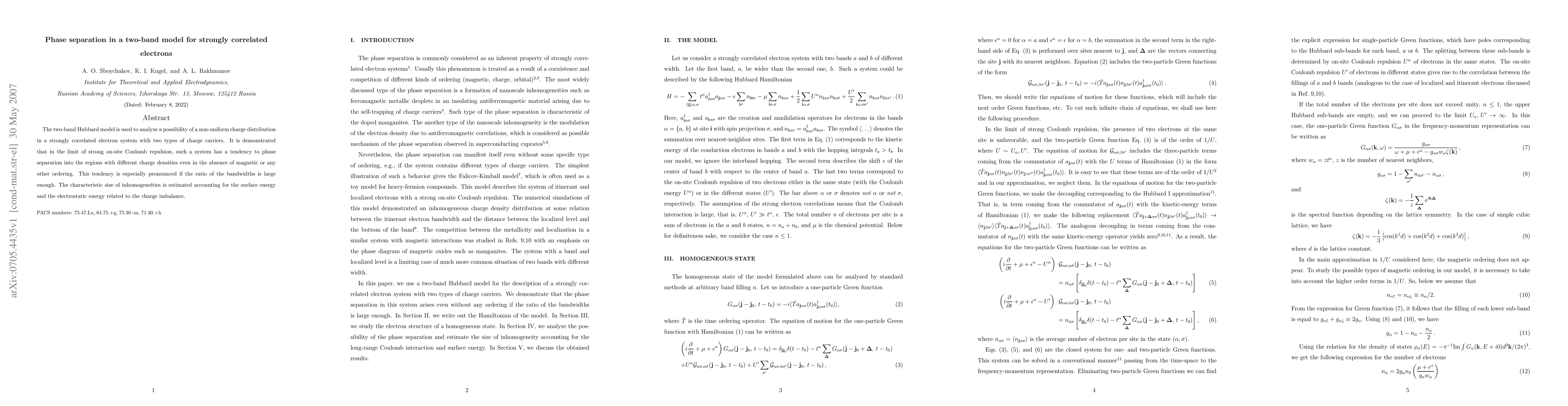 The two-band Hubbard model reveals a tendency for phase separation in strongly correlated electron systems with two charge carriers, driven by strong on-site Coulomb repulsion, even without magnetic or other ordering. The size of inhomogeneities is determined by surface and electrostatic energies associated with charge density differences.
