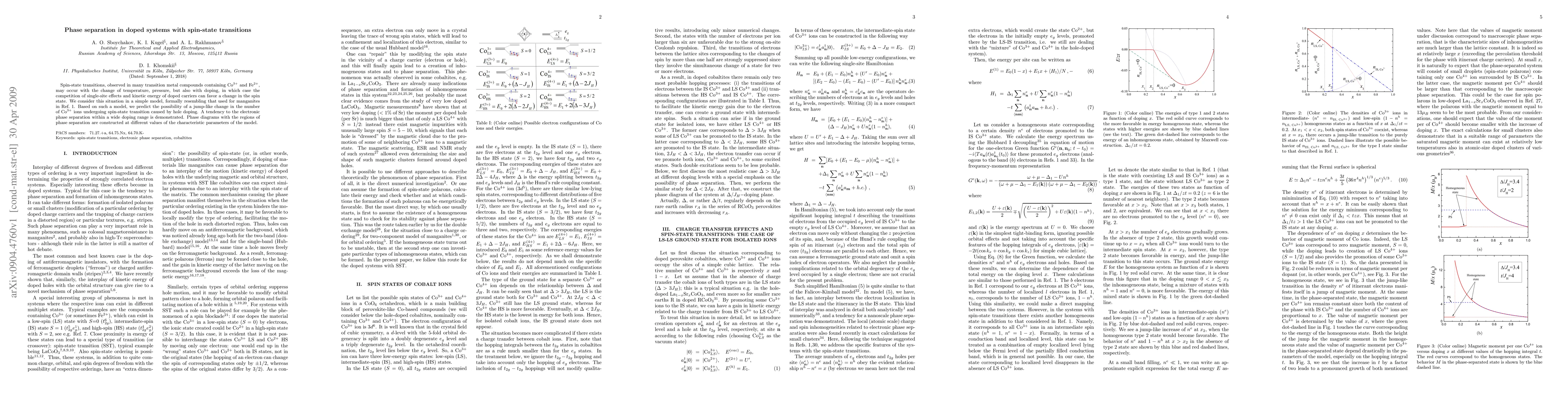 Spin-state transitions, observed in many transition metal compounds containing Co$^{3+}$ and Fe$^{2+}$, may occur with the change of temperature, pressure, but also with doping, in which case the competition of single-site effects and kinetic energy of doped carriers can favor a change in the spin state. We consider this situation in a simple model, formally resembling that used for manganites in Phys. Rev. Lett. 95, 267210 (2005). Based on such a model, we predict the possibility of a jump-like change in the number of Co$^{3+}$ ions undergoing spin-state transition caused by hole doping. A tendency to the electronic phase separation within a wide doping range is demonstrated. Phase diagrams with the regions of phase separation are constructed at different values of the characteristic parameters of the model.