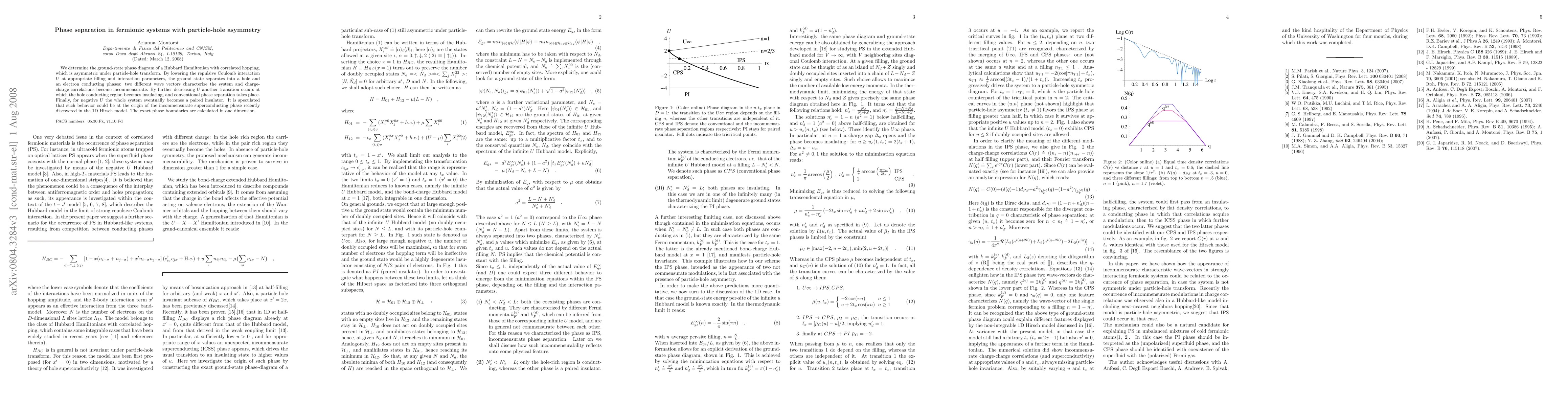 This paper explores the ground-state phase diagram of a fermionic Hubbard model with particle-hole asymmetry, revealing phase separation into electron and hole conducting phases under varying interaction strengths. It concludes with the emergence of incommensurate charge correlations and speculates on the origin of a recently discovered incommensurate superconducting phase in the 1D Hirsch model.