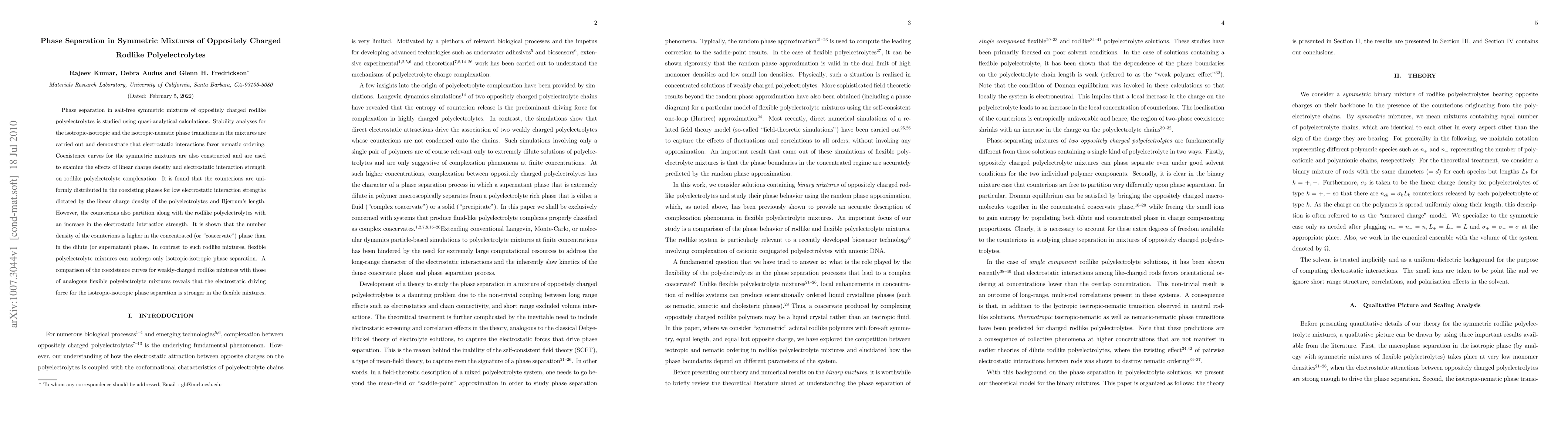 This paper investigates phase separation in salt-free mixtures of oppositely charged rodlike polyelectrolytes, showing that electrostatic interactions favor nematic ordering. It finds that counterions partition with the polyelectrolytes at higher electrostatic interaction strengths, leading to higher counterion density in the concentrated phase.