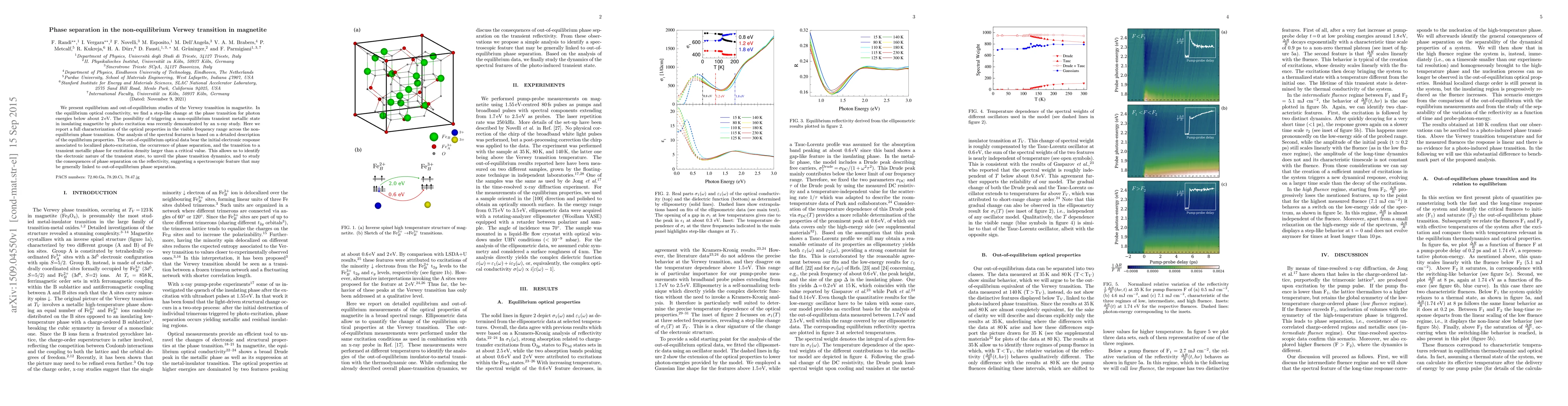 This paper investigates the Verwey transition in magnetite, identifying a step-like change in optical conductivity at the phase transition and characterizing the transient metallic state triggered by photo excitation. The study reveals the dynamics of phase separation and its impact on reflectivity, suggesting a spectroscopic feature linked to out-of-equilibrium phase separation.