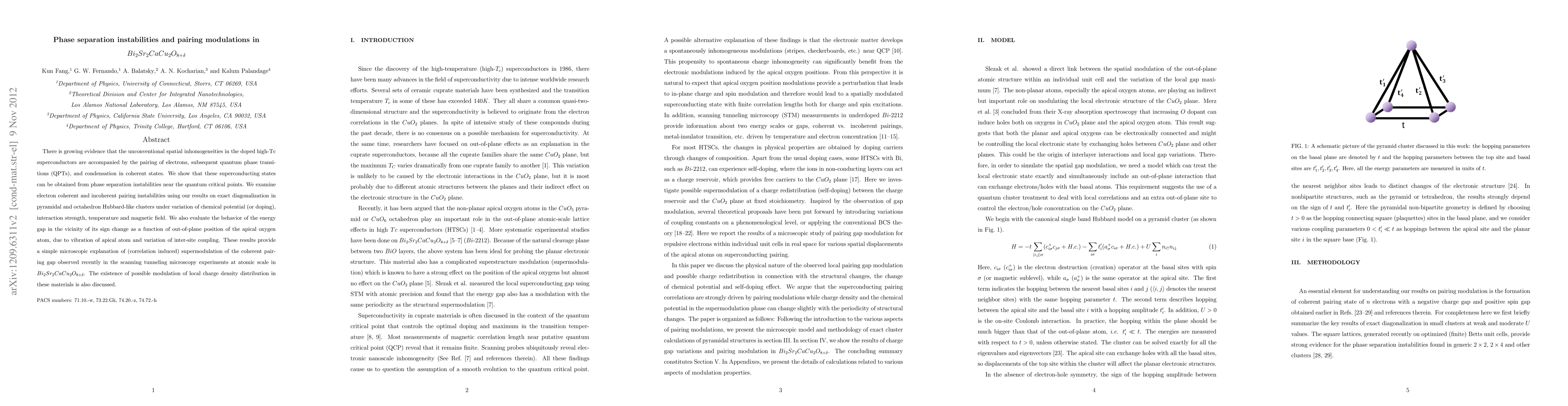 There is growing evidence that the unconventional spatial inhomogeneities in the doped high-Tc superconductors are accompanied by the pairing of electrons, subsequent quantum phase transitions (QPTs), and condensation in coherent states. We show that these superconducting states can be obtained from phase separation instabilities near the quantum critical points. We examine electron coherent and incoherent pairing instabilities using our results on exact diagonalization in pyramidal and octahedron Hubbard-like clusters under variation of chemical potential (or doping), interaction strength, temperature and magnetic field. We also evaluate the behavior of the energy gap in the vicinity of its sign change as a function of out-of-plane position of the apical oxygen atom, due to vibration of apical atom and variation of inter-site coupling. These results provide a simple microscopic explanation of (correlation induced) supermodulation of the coherent pairing gap observed recently in the scanning tunneling microscopy experiments at atomic scale in $Bi_2Sr_2CaCu_2O_{8+\delta}$. The existence of possible modulation of local charge density distribution in these materials is also discussed.