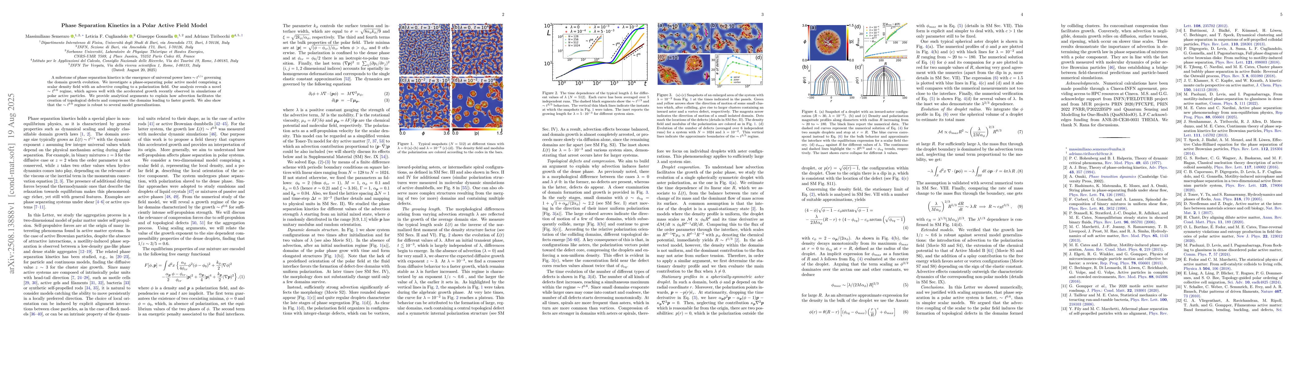 The study investigates phase separation kinetics in a polar active field model using numerical simulations and scaling arguments. It solves equations governing the dynamics of a scalar density field advectively coupled to a polarization field via finite differences on square lattices with periodic boundary conditions.