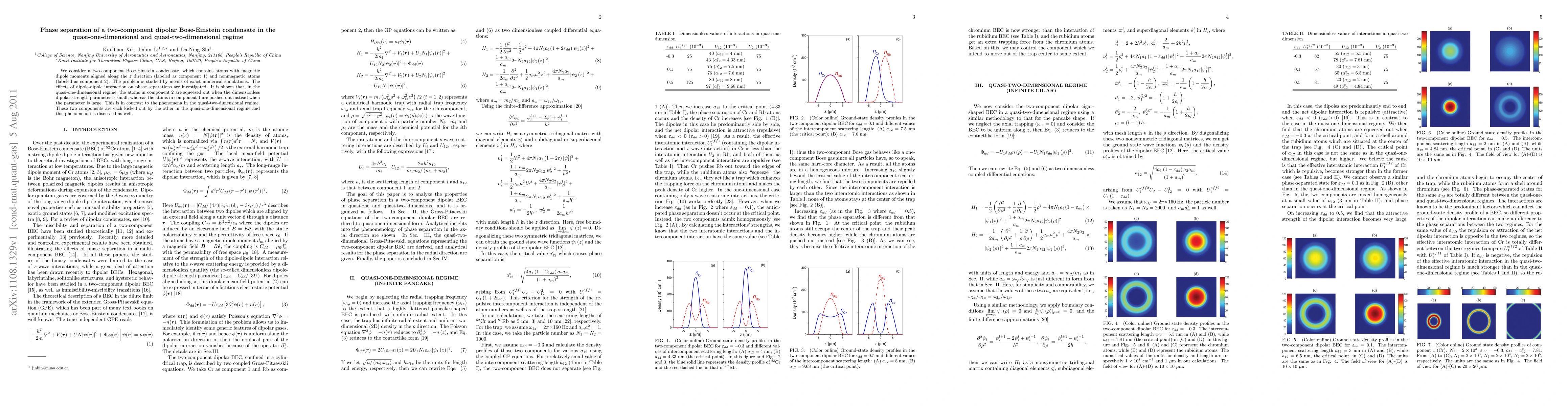 This paper explores phase separation in a two-component dipolar Bose-Einstein condensate, revealing that dipole-dipole interactions lead to different behaviors in quasi-one-dimensional and quasi-two-dimensional regimes. In the former, component 2 atoms are squeezed out for small dipolar strength, while component 1 atoms are pushed out for large strength, contrasting with the mutual expulsion observed in the latter.