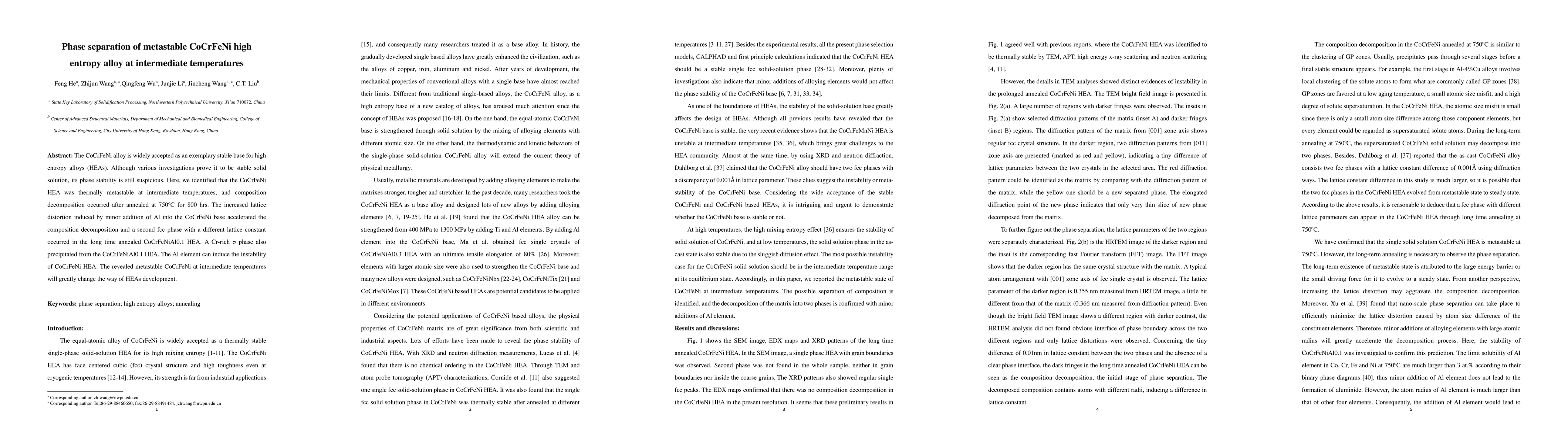 This study reveals that CoCrFeNi high entropy alloy, typically considered stable, exhibits thermal metastability at intermediate temperatures, leading to composition decomposition upon annealing. The addition of Al further accelerates this decomposition, resulting in a second fcc phase and a Cr-rich σ phase, indicating Al-induced instability in CoCrFeNi.