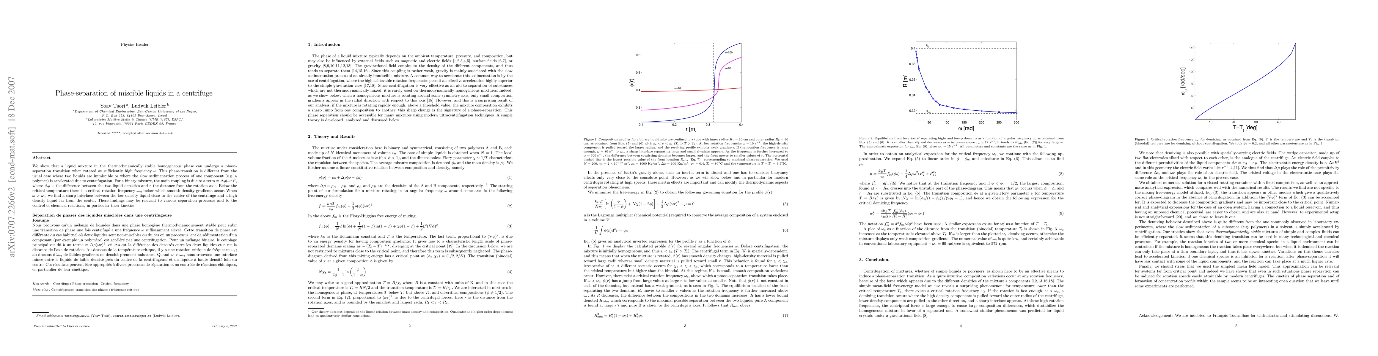 This study demonstrates that a stable liquid mixture can undergo phase separation when centrifuged at high rotational frequencies, driven by a density gradient term. Below a critical rotation frequency, a sharp interface forms between low and high density liquids, offering insights into separation processes and reaction kinetics.