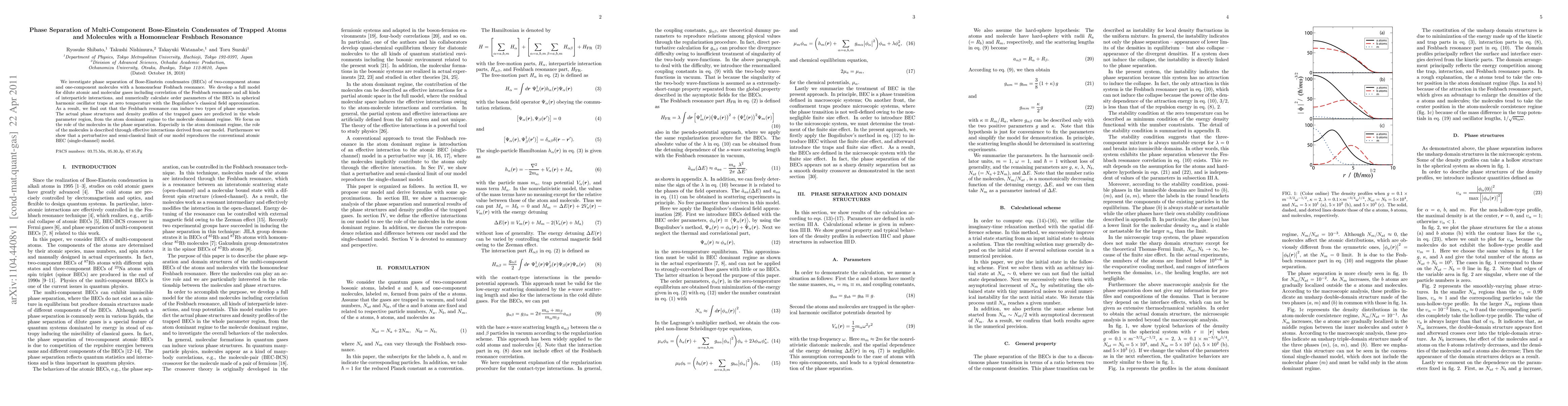 This paper explores phase separation in multi-component Bose-Einstein condensates (BECs) involving atoms and molecules under a homonuclear Feshbach resonance, revealing two types of phase separation induced by the resonance. The study develops a comprehensive model incorporating interparticle interactions and predicts phase structures and density profiles across various regimes.