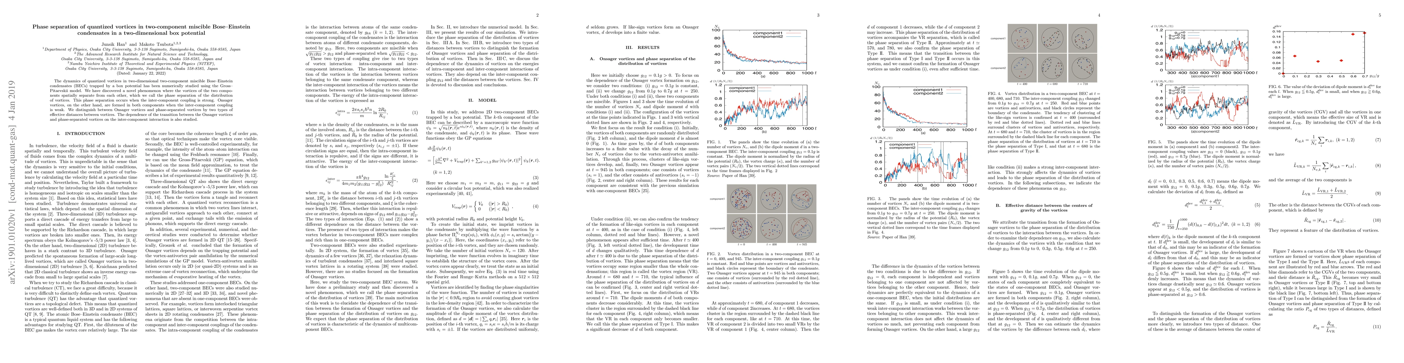 This research investigates the dynamics of quantized vortices in two-component Bose-Einstein condensates under a two-dimensional box potential, revealing a novel phase separation phenomenon where vortices of different components spatially separate when inter-component coupling is strong. The study distinguishes between Onsager and phase-separated vortices using effective distances and examines the transition between these states based on inter-component interaction.