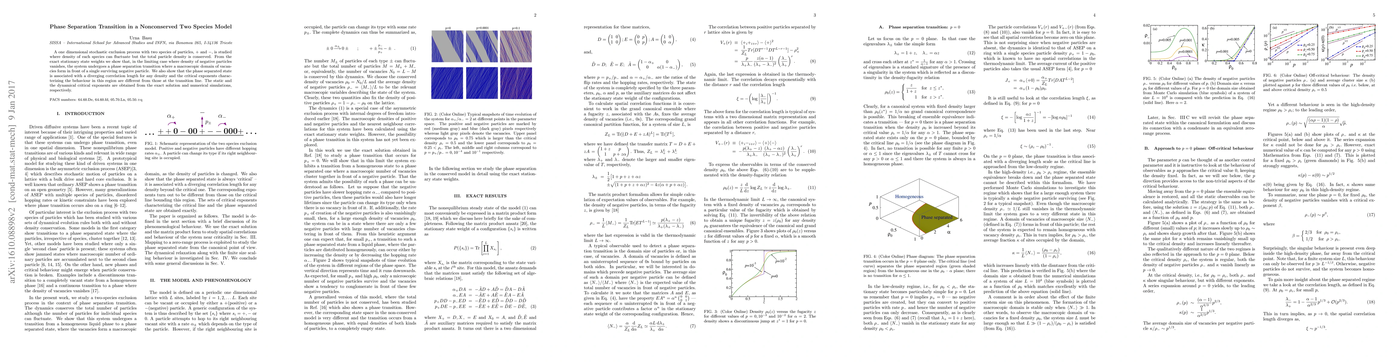 A 2-species model exhibits a phase separation transition where vacancies form in front of a single surviving negative particle, with diverging correlation length and distinct critical exponents.