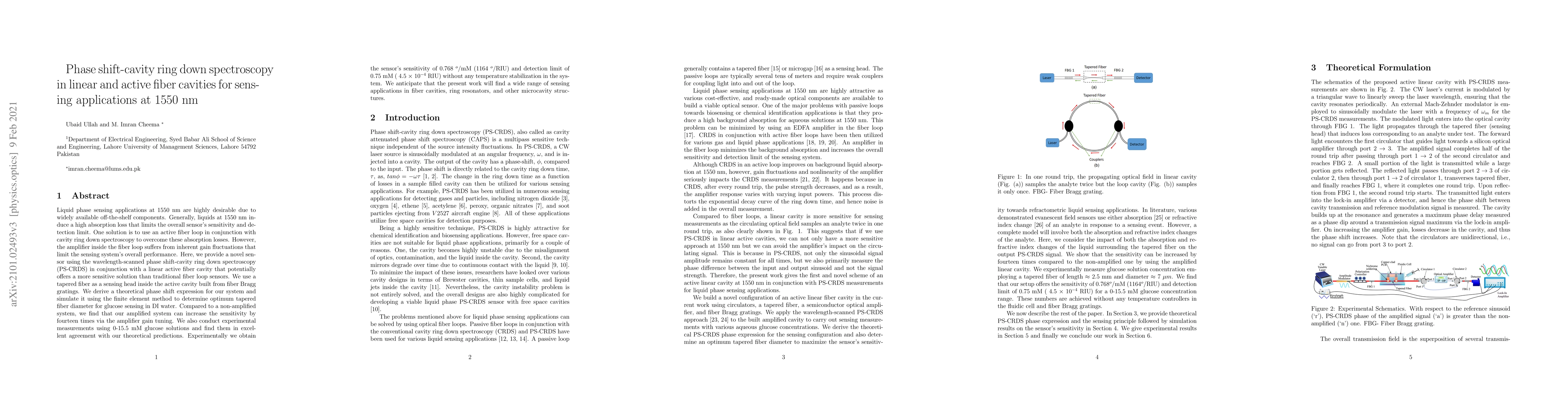 Liquid phase sensing applications at 1550~nm are highly desirable due to widely available off-the-shelf components. Generally, liquids at 1550~nm induce a high absorption loss that limits the overall sensor's sensitivity and detection limit. One solution is to use an active fiber loop in conjunction with cavity ring down spectroscopy to overcome these absorption losses. However, the amplifier inside the fiber loop suffers from inherent gain fluctuations that limit the sensing system's overall performance. Here, we provide a novel sensor using the wavelength-scanned phase shift-cavity ring down spectroscopy (PS-CRDS) in conjunction with a linear active fiber cavity that potentially offers a more sensitive solution than traditional fiber loop sensors. We use a tapered fiber as a sensing head inside the active cavity built from fiber Bragg gratings. We derive a theoretical phase shift expression for our system and simulate it using the finite element method to determine optimum tapered fiber diameter for glucose sensing in DI water. Compared to a non-amplified system, we find that our amplified system can increase the sensitivity by fourteen times via the amplifier gain tuning. We also conduct experimental measurements using 0-15.5~mM glucose solutions and find them in excellent agreement with our theoretical predictions. Experimentally we obtain the sensor's sensitivity of 0.768~$^o$/mM (1164~$^o$/RIU) and detection limit of 0.75~mM ( 4.5~$\times$~10$^{-4}$~RIU) without any temperature stabilization in the system. We anticipate that the present work will find a wide range of sensing applications in fiber cavities, ring resonators, and other microcavity structures.