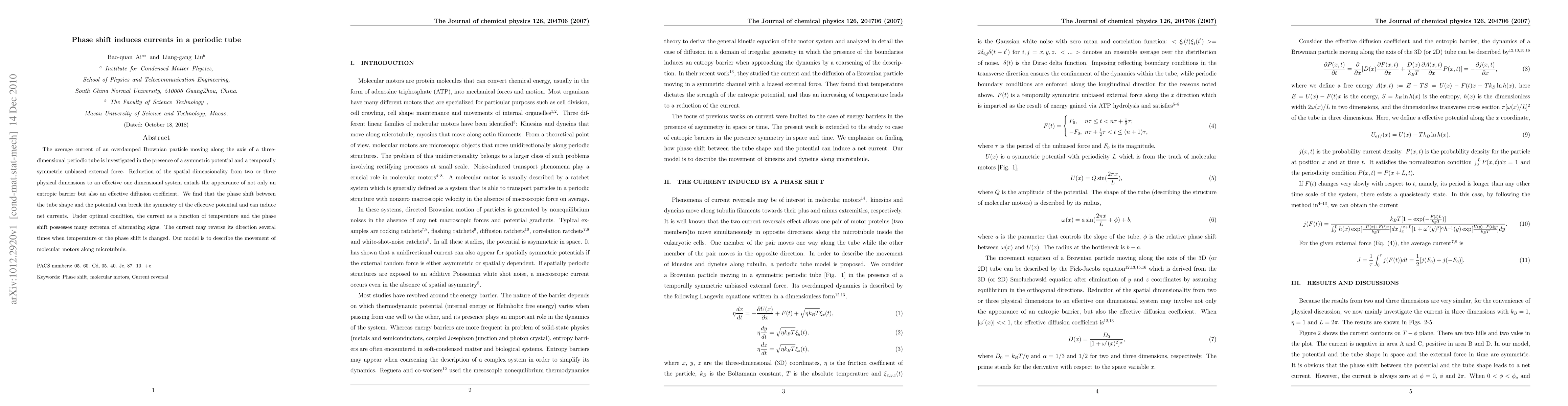 The average current of an overdamped Brownian particle moving along the axis of a three-dimensional periodic tube is investigated in the presence of a symmetric potential and a temporally symmetric unbiased external force. Reduction of the spatial dimensionality from two or three physical dimensions to an effective one dimensional system entails the appearance of not only an entropic barrier but also an effective diffusion coefficient. We find that the phase shift between the tube shape and the potential can break the symmetry of the effective potential and can induce net currents. Under optimal condition, the current as a function of temperature and the phase shift possesses many extrema of alternating signs. The current may reverse its direction several times when temperature or the phase shift is changed. Our model is to describe the movement of molecular motors along microtubule.