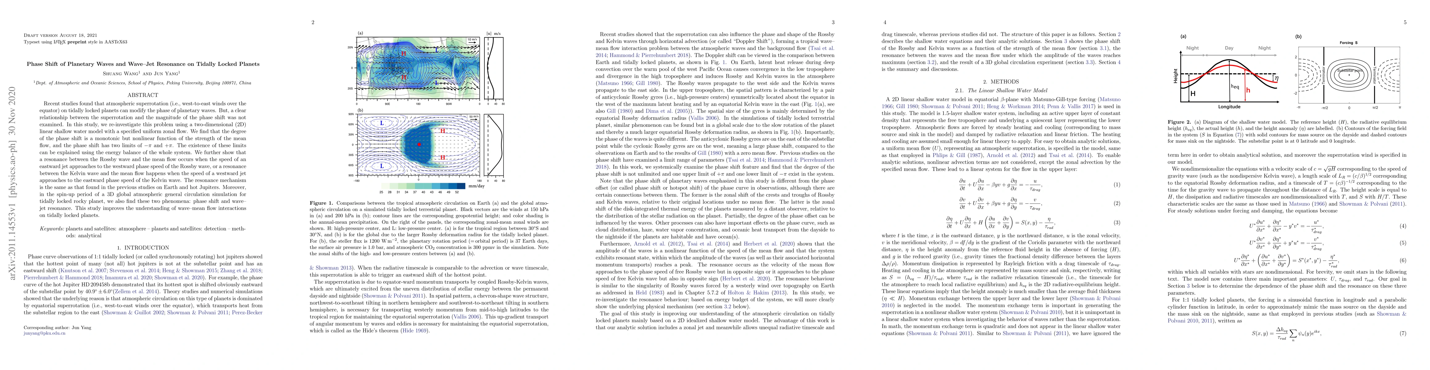 Recent studies found that atmospheric superrotation (i.e., west-to-east winds over the equator) on tidally locked planets can modify the phase of planetary waves. But, a clear relationship between the superrotation and the magnitude of the phase shift was not examined. In this study, we re-investigate this problem using a two-dimensional (2D) linear shallow water model with a specified uniform zonal flow. We find that the degree of the phase shift is a monotonic but nonlinear function of the strength of the mean flow, and the phase shift has two limits of -$\pi$ and +$\pi$. The existence of these limits can be explained using the energy balance of the whole system. We further show that a resonance between the Rossby wave and the mean flow occurs when the speed of an eastward jet approaches to the westward phase speed of the Rossby wave, or a resonance between the Kelvin wave and the mean flow happens when the speed of a westward jet approaches to the eastward phase speed of the Kelvin wave. The resonance mechanism is the same as that found in the previous studies on Earth and hot Jupiters. Moreover, in the spin-up period of a 3D global atmospheric general circulation simulation for tidally locked rocky planet, we also find these two phenomena: phase shift and wave--jet resonance. This study improves the understanding of wave--mean flow interactions on tidally locked planets.