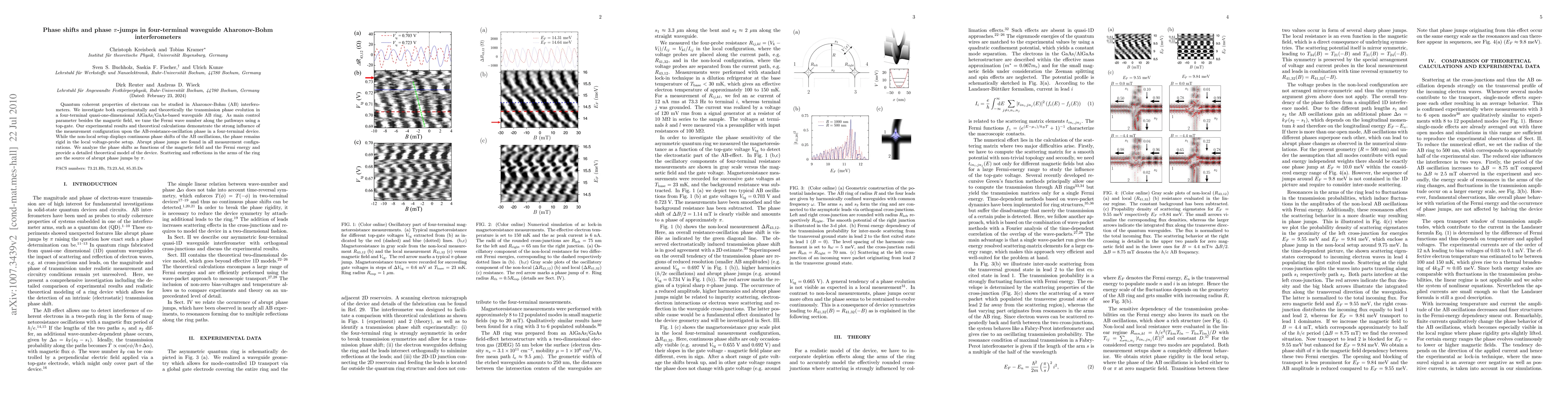 Quantum coherent properties of electrons can be studied in Aharonov-Bohm (AB) interferometers. We investigate both experimentally and theoretically the transmission phase evolution in a four-terminal quasi-one-dimensional AlGaAs/GaAs-based waveguide AB ring. As main control parameter besides the magnetic field, we tune the Fermi wave number along the pathways using a top-gate. Our experimental results and theoretical calculations demonstrate the strong influence of the measurement configuration upon the AB-resistance-oscillation phase in a four-terminal device. While the non-local setup displays continuous phase shifts of the AB oscillations, the phase remains rigid in the local voltage-probe setup. Abrupt phase jumps are found in all measurement configurations. We analyze the phase shifts as functions of the magnetic field and the Fermi energy and provide a detailed theoretical model of the device. Scattering and reflections in the arms of the ring are the source of abrupt phase jumps by $\pi$.