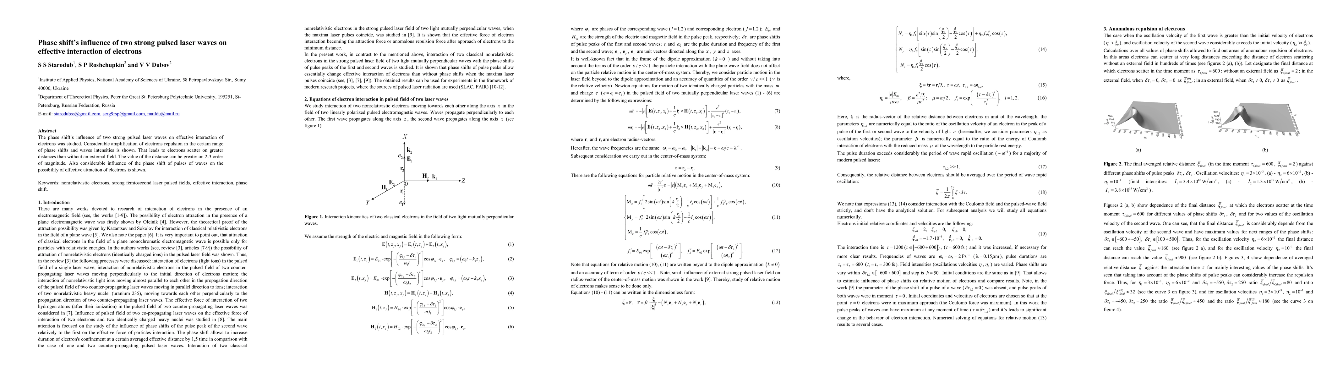The phase shift's influence of two strong pulsed laser waves on effective interaction of electrons was studied. Considerable amplification of electrons repulsion in the certain range of phase shifts and waves intensities is shown. That leads to electrons scatter on greater distances than without an external field. The value of the distance can be greater on 2-3 order of magnitude. Also considerable influence of the phase shift of pulses of waves on the possibility of effective attraction of electrons is shown.