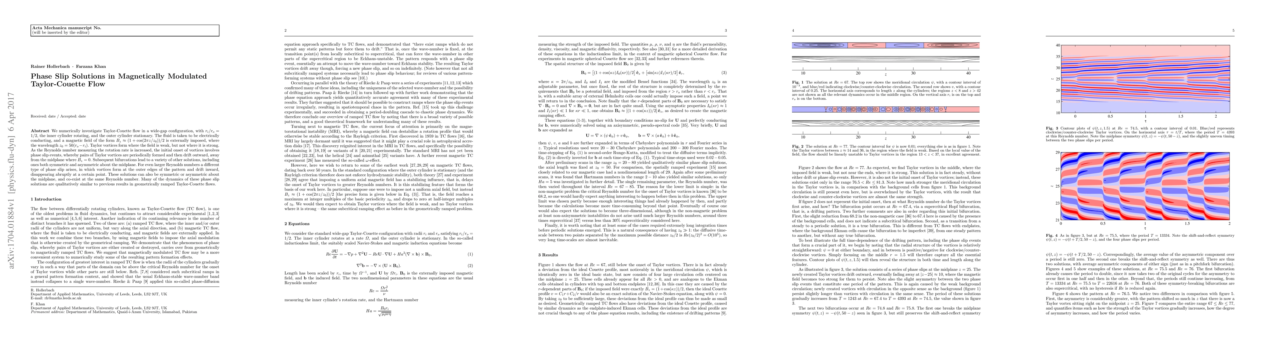 Researchers studied magnetically modulated Taylor-Couette flow, finding that phase slip solutions form at varying Reynolds numbers, including periodic and asymmetric patterns, with dynamics similar to previous geometrically ramped flows.