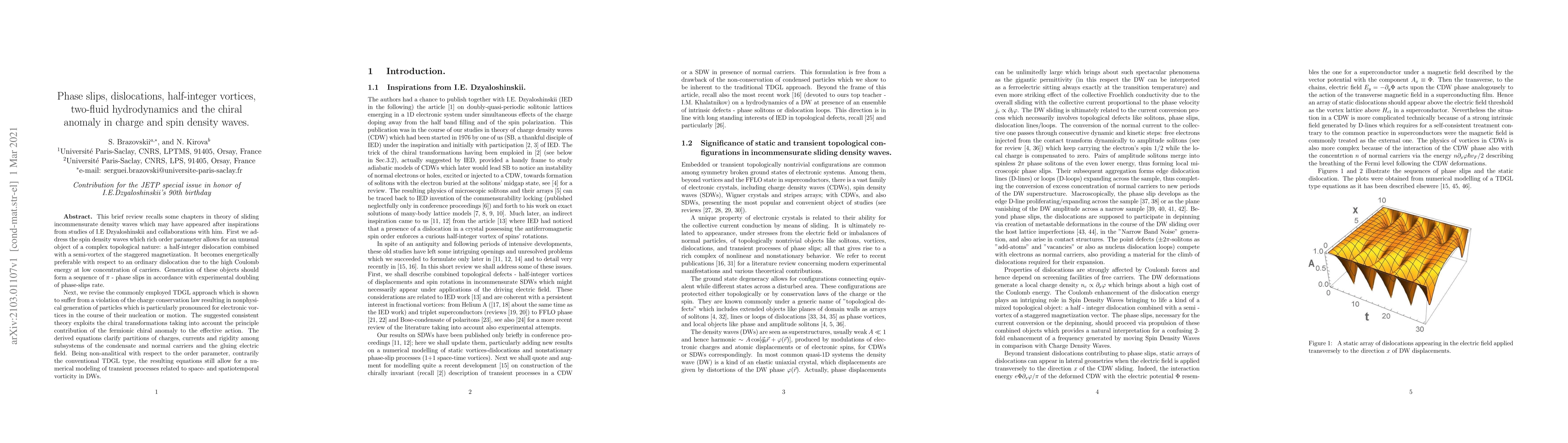 This brief review recalls some chapters in theory of sliding incommensurate density waves which may have appeared after inspirations from studies of I.E Dzyaloshinskii and collaborations with him. First we address the spin density waves which rich order parameter allows for an unusual object of a complex topological nature: a half-integer dislocation combined with a semi-vortex of the staggered magnetization. It becomes energetically preferable with respect to an ordinary dislocation due to the high Coulomb energy at low concentration of carriers. Generation of these objects should form a sequence of pi-phase slips in accordance with experimental doubling of phase-slips rate. Next, we revise the commonly employed TDGL approach which is shown to suffer from a violation of the charge conservation law resulting in nonphysical generation of particles which is particularly pronounced for electronic vortices in the course of their nucleation or motion. The suggested consistent theory exploits the chiral transformations taking into account the principle contribution of the fermionic chiral anomaly to the effective action. The derived equations clarify partitions of charges,currents and rigidity among subsystems of the condensate and normal carriers and the gluing electric field. Being non-analytical with respect to the order parameter, contrarily the conventional TDGL type, the resulting equations still allow for a numerical modeling of transient processes related to space- and spatio-temporal vorticity in DWs.