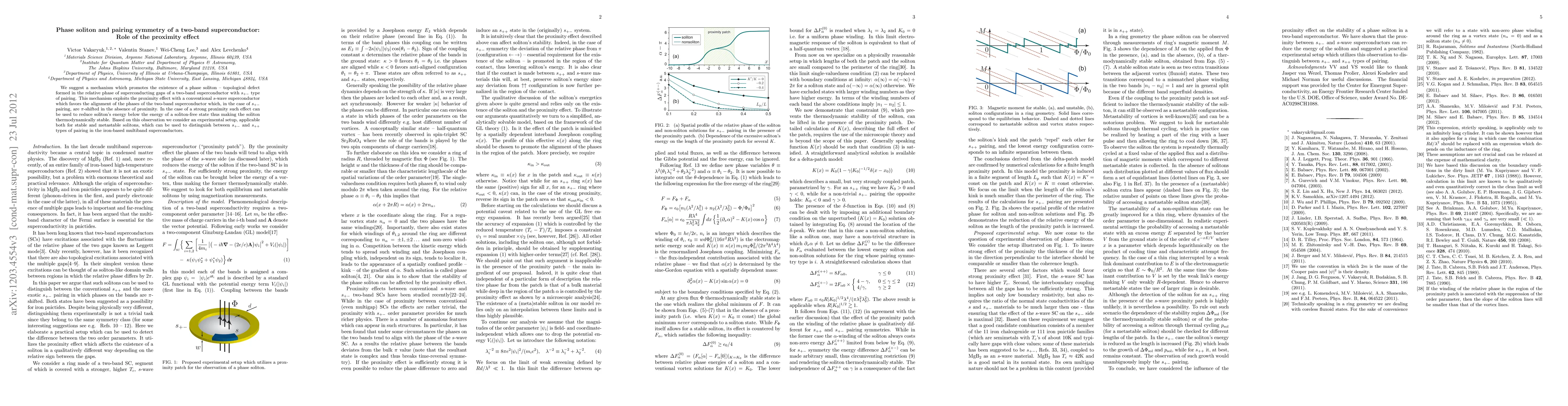 We suggest a mechanism which promotes the existence of a phase soliton -- topological defect formed in the relative phase of superconducting gaps of a two-band superconductor with s+- type of pairing. This mechanism exploits the proximity effect with a conventional s-wave superconductor which favors the alignment of the phases of the two-band superconductor which, in the case of s+- pairing, are pi-shifted in the absence of proximity. In the case of a strong proximity such effect can be used to reduce soliton's energy below the energy of a soliton-free state thus making the soliton thermodynamically stable. Based on this observation we consider an experimental setup, applicable both for stable and metastable solitons, which can be used to distinguish between s+- and s++ types of pairing in the iron-based multiband superconductors.