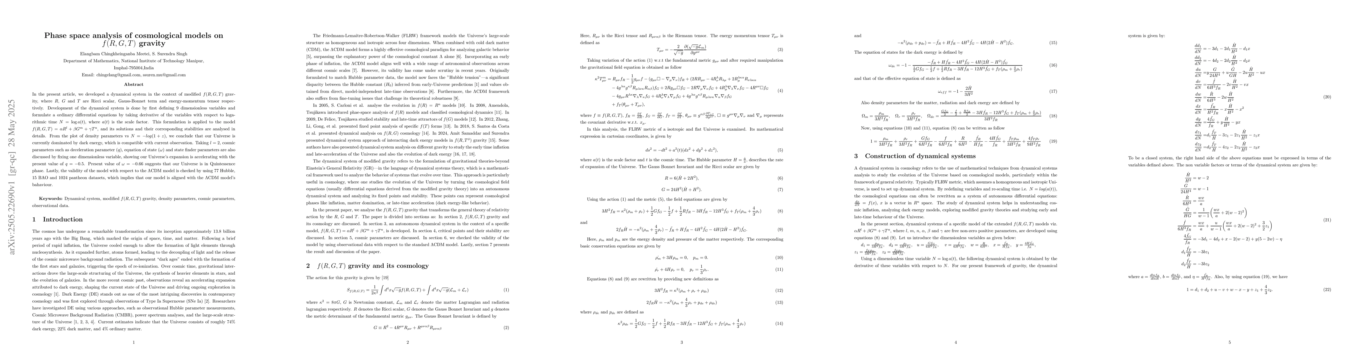 Development and analysis of a dynamical system in $f(R,G,T)$ gravity, providing insights into cosmic parameters and model validation against observational data.