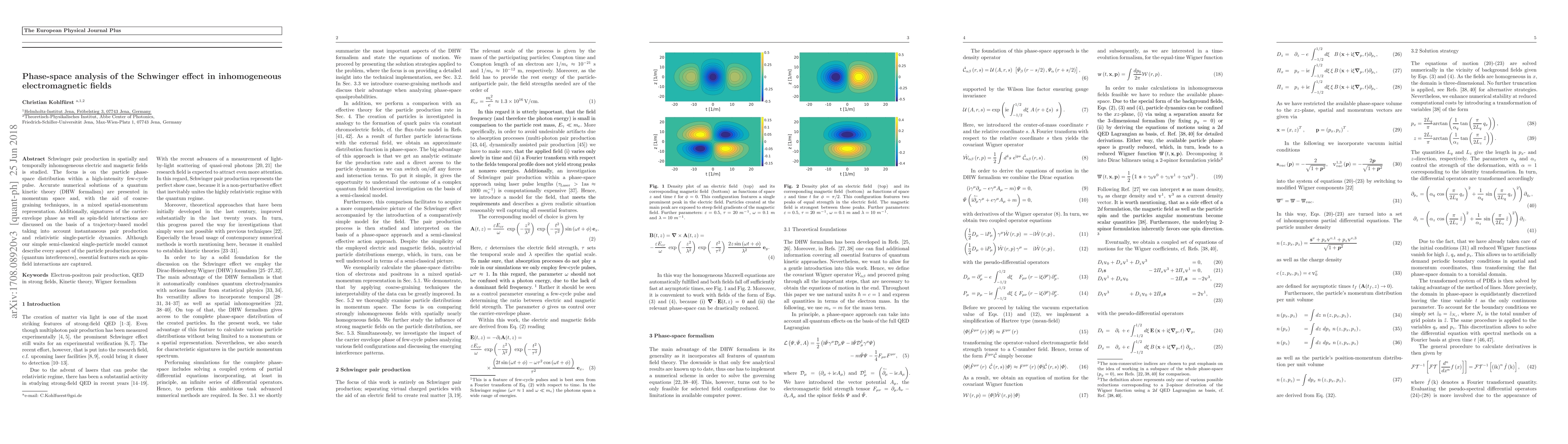 This paper investigates Schwinger pair production in inhomogeneous electromagnetic fields using quantum kinetic theory and numerical solutions. It focuses on phase-space distributions during high-intensity few-cycle pulses, highlighting spin-field interactions and the carrier-envelope phase, while acknowledging the limitations of the semi-classical model.