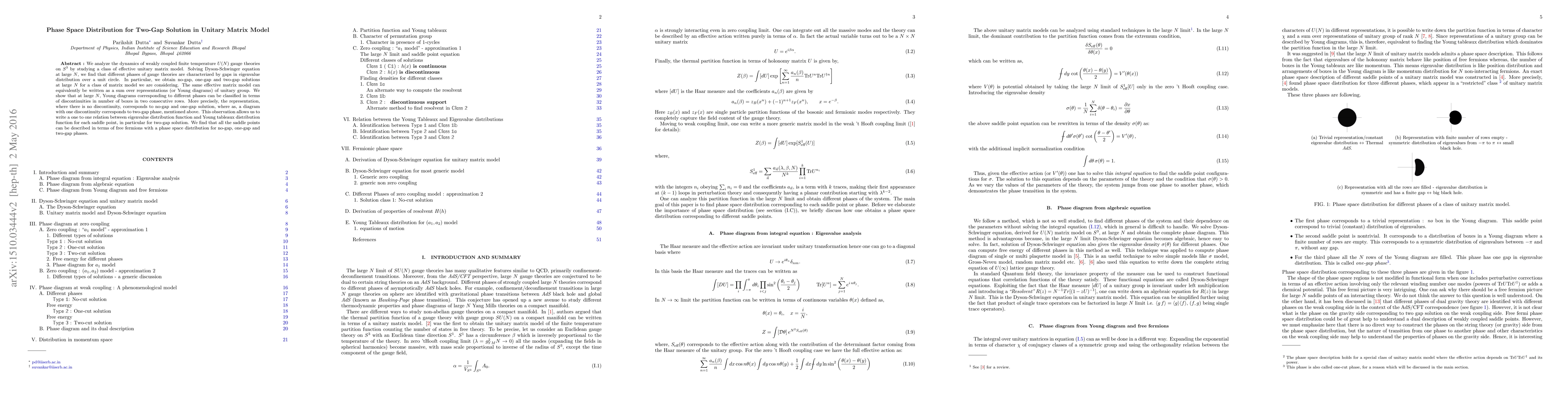 We analyze the dynamics of weakly coupled finite temperature $U(N)$ gauge theories on $S^3$ by studying a class of effective unitary matrix model. Solving Dyson-Schwinger equation at large $N$, we find that different phases of gauge theories are characterized by gaps in eigenvalue distribution over a unit circle. In particular, we obtain no-gap, one-gap and two-gap solutions at large $N$ for a class of matrix model we are considering. The same effective matrix model can equivalently be written as a sum over representations (or Young diagrams) of unitary group. We show that at large $N$, Young diagrams corresponding to different phases can be classified in terms of discontinuities in number of boxes in two consecutive rows. More precisely, the representation, where there is no discontinuity, corresponds to no-gap and one-gap solution, where as, a diagram with one discontinuity corresponds to two-gap phase, mentioned above. This observation allows us to write a one to one relation between eigenvalue distribution function and Young tableaux distribution function for each saddle point, in particular for two-gap solution. We find that all the saddle points can be described in terms of free fermions with a phase space distribution for no-gap, one-gap and two-gap phases.