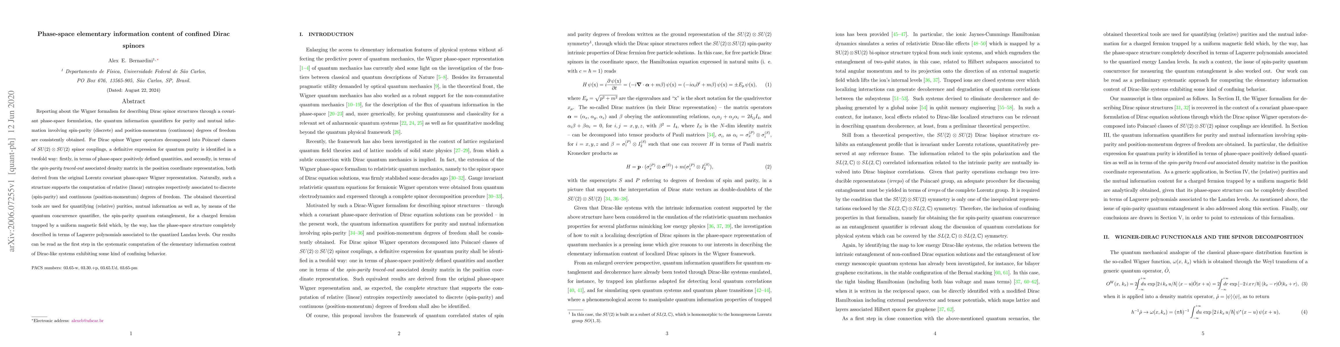Reporting about the Wigner formalism for describing Dirac spinor structures through a covariant phase-space formulation, the quantum information quantifiers for purity and mutual information involving spin-parity (discrete) and position-momentum (continuous) degrees of freedom are consistently obtained. For Dirac spinor Wigner operators decomposed into Poincar\'e classes of $SU(2) \otimes SU(2)$ spinor couplings, a definitive expression for quantum purity is identified in a twofold way: firstly, in terms of phase-space positively defined quantities, and secondly, in terms of the {\em spin-parity traced-out} associated density matrix in the position coordinate representation, both derived from the original Lorentz covariant phase-space Wigner representation. Naturally, such a structure supports the computation of relative (linear) entropies respectively associated to discrete (spin-parity) and continuous (position-momentum) degrees of freedom. The obtained theoretical tools are used for quantifying (relative) purities, mutual information as well as, by means of the quantum concurrence quantifier, the spin-parity quantum entanglement, for a charged fermion trapped by a uniform magnetic field which, by the way, has the phase-space structure completely described in terms of Laguerre polynomials associated to the quantized Landau levels. Our results can be read as the first step in the systematic computation of the elementary information content of Dirac-like systems exhibiting some kind of confining behavior.