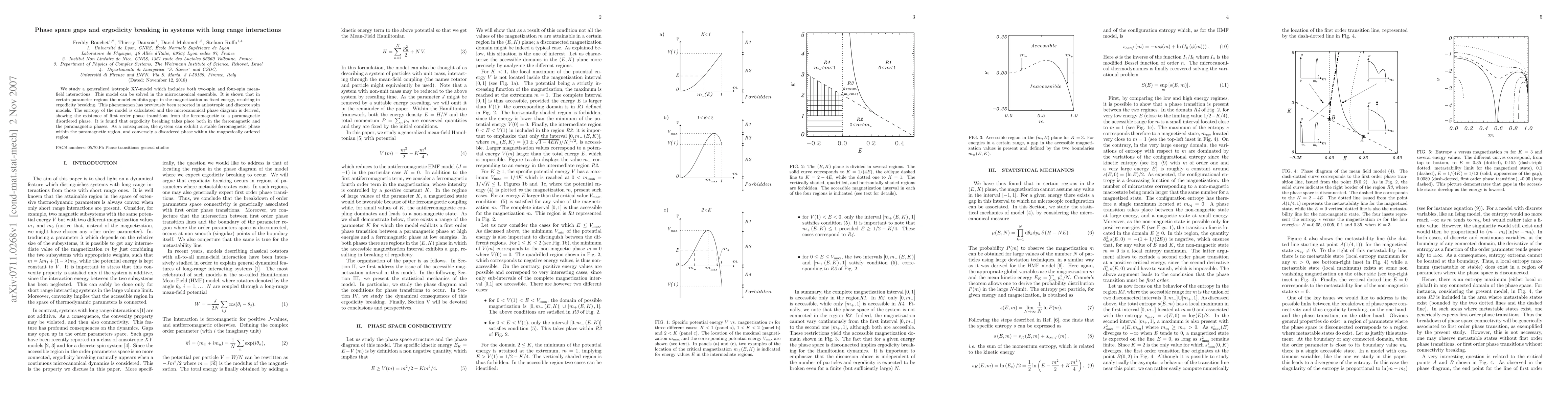 This paper investigates a generalized isotropic XY-model with long-range interactions, revealing phase space gaps and ergodicity breaking in both ferromagnetic and paramagnetic phases. The study finds stable ferromagnetic phases within the paramagnetic region and disordered phases within the ordered region, indicating complex phase transitions.