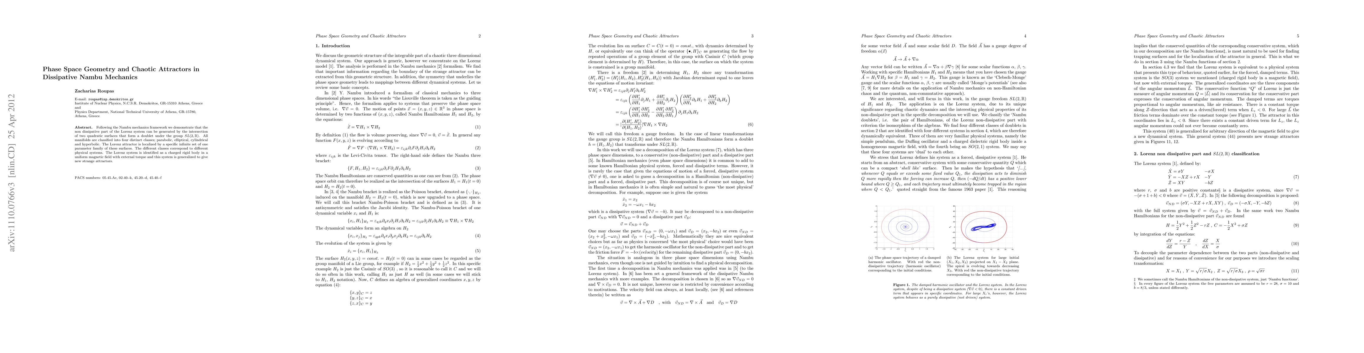 This paper explores the phase space geometry of dissipative Nambu mechanics, showing that the Lorenz system's non-dissipative part arises from intersecting quadratic surfaces forming a doublet under SL(2,R). It classifies manifolds into four types and identifies the Lorenz attractor as a charged rigid body in a magnetic field, leading to new strange attractors.