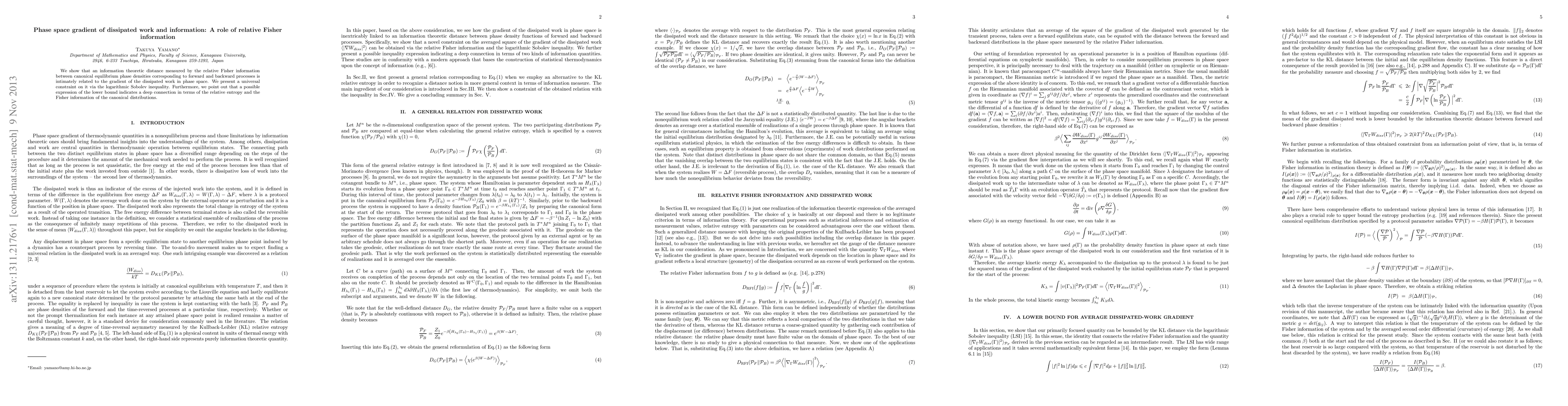 This paper establishes a link between the relative Fisher information and the gradient of dissipated work in phase space, showing that the former measures the distance between equilibrium phase densities and imposes a universal constraint via the logarithmic Sobolev inequality. It also highlights a connection between the relative entropy and Fisher information of canonical distributions.