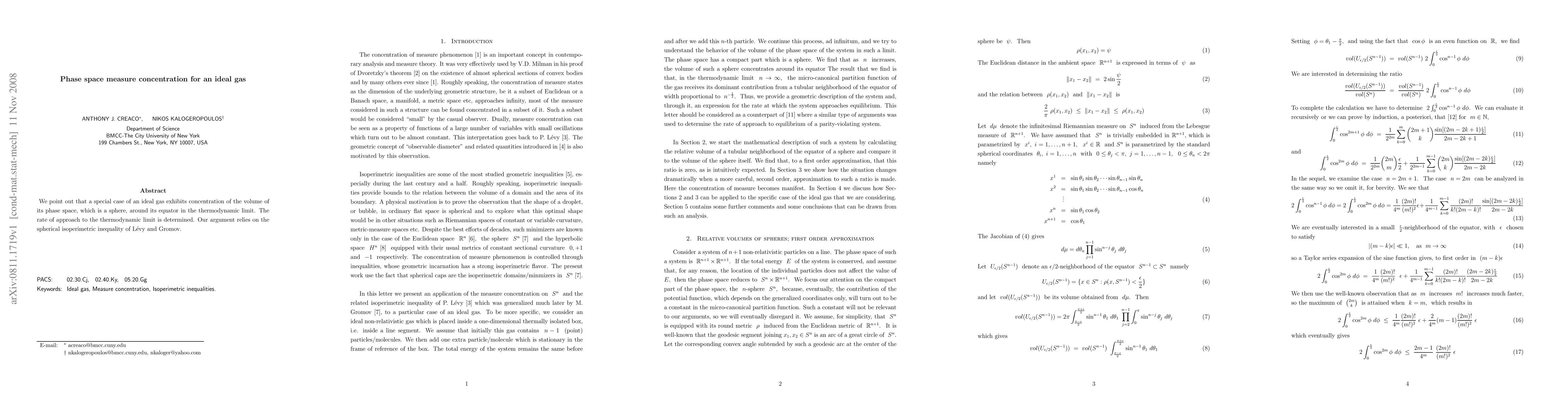 We point out that a special case of an ideal gas exhibits concentration of the volume of its phase space, which is a sphere, around its equator in the thermodynamic limit. The rate of approach to the thermodynamic limit is determined. Our argument relies on the spherical isoperimetric inequality of L\'{e}vy and Gromov.