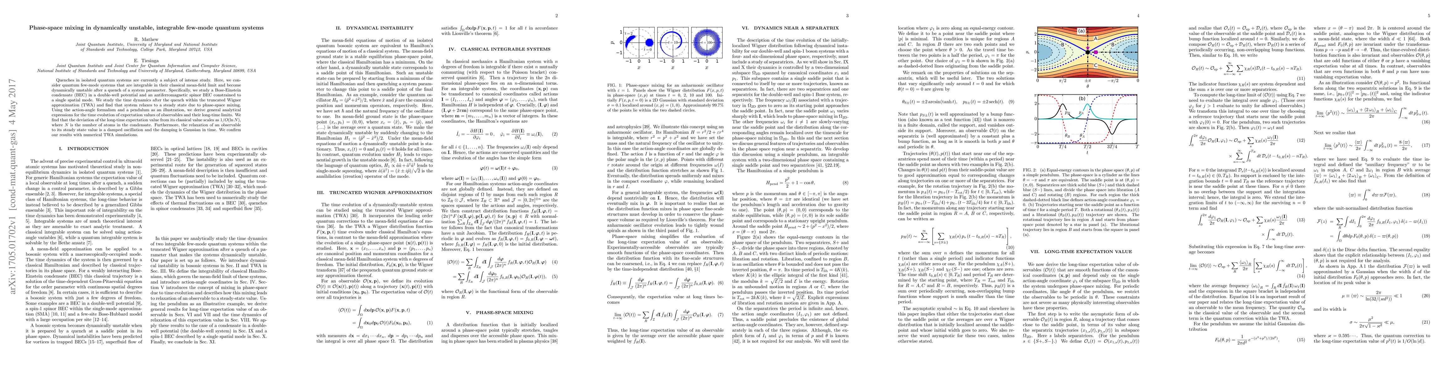 Quenches in isolated quantum systems are currently a subject of intense study. Here, we consider quantum few-mode systems that are integrable in their classical mean-field limit and become dynamically unstable after a quench of a system parameter. Specifically, we study a Bose-Einstein condensate (BEC) in a double-well potential and an antiferromagnetic spinor BEC constrained to a single spatial mode. We study the time dynamics after the quench within the truncated Wigner approximation (TWA) and find that system relaxes to a steady state due to phase-space mixing. Using the action-angle formalism and a pendulum as an illustration, we derive general analytical expressions for the time evolution of expectation values of observables and their long-time limits. We find that the deviation of the long-time expectation value from its classical value scales as $1/O(\ln N )$, where $N$ is the number of atoms in the condensate. Furthermore, the relaxation of an observable to its steady state value is a damped oscillation and the damping is Gaussian in time. We confirm our results with numerical TWA simulations.