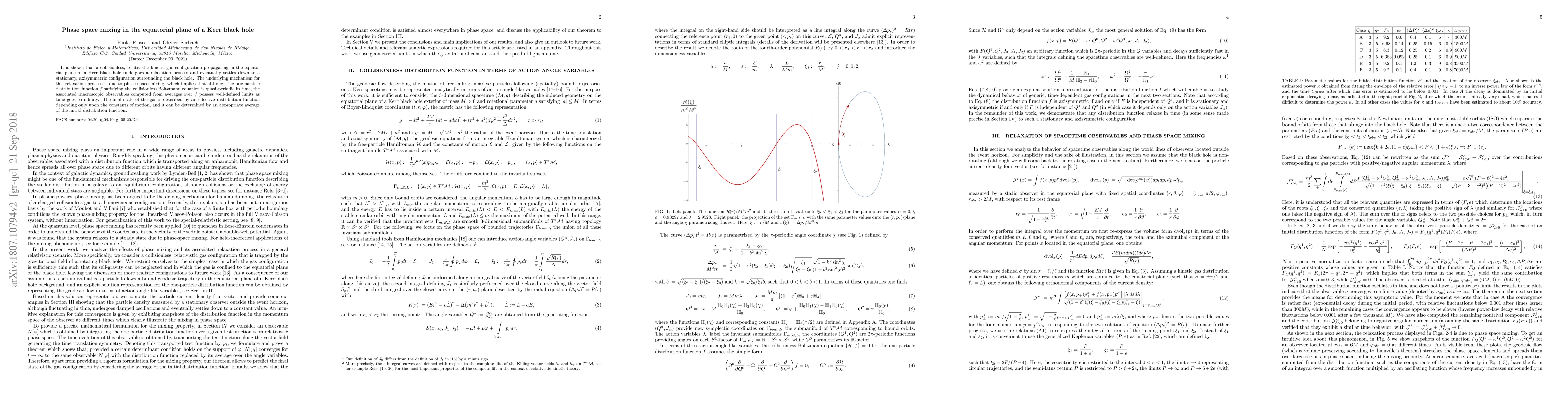 This paper demonstrates that a relativistic kinetic gas in the equatorial plane of a Kerr black hole undergoes relaxation to a stationary configuration due to phase space mixing. The final state is characterized by an effective distribution function dependent on constants of motion derived from the initial conditions.