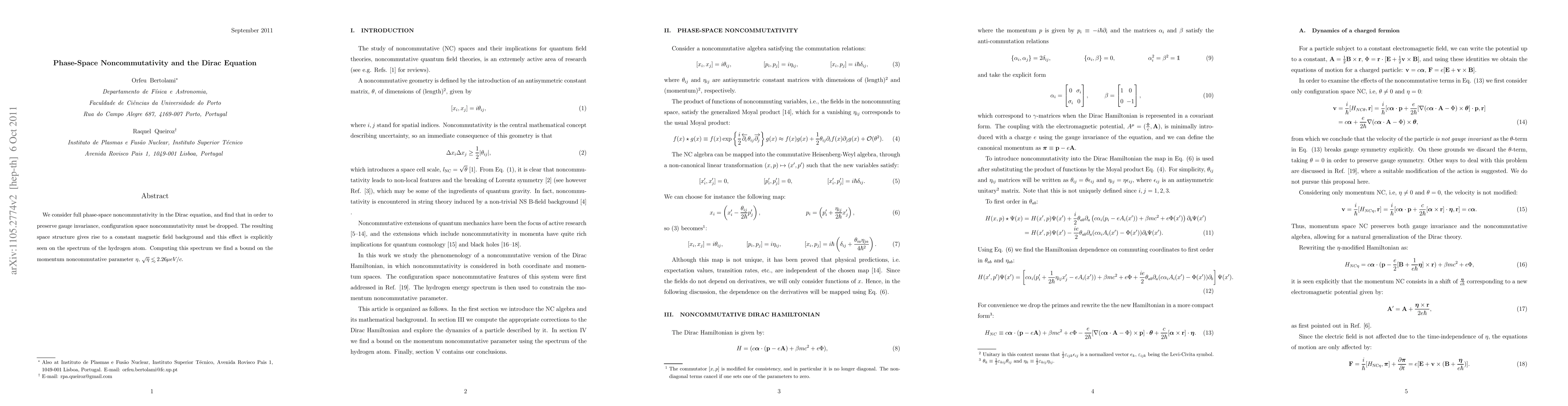 This paper explores the implications of phase-space noncommutativity in the Dirac equation, revealing that gauge invariance necessitates the exclusion of configuration space noncommutativity. This results in a constant magnetic field background, affecting the hydrogen atom spectrum, and provides a bound on the momentum noncommutative parameter $\eta$ of $\sqrt{\eta}\lsim2.26\mu eV/c$.
