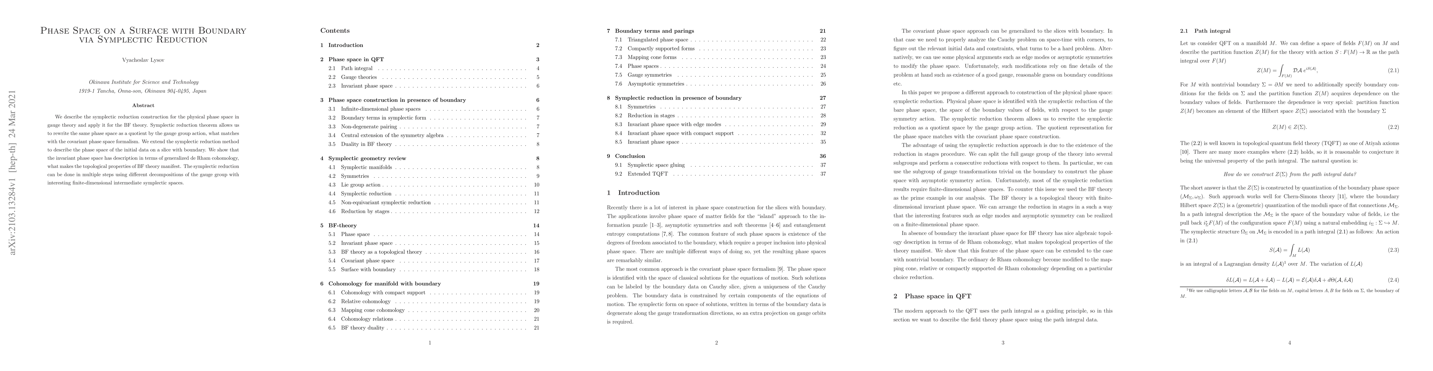 This paper introduces a method to describe the phase space of gauge theory on a surface with boundary using symplectic reduction, revealing the topological properties of BF theory in terms of generalized de Rham cohomology.