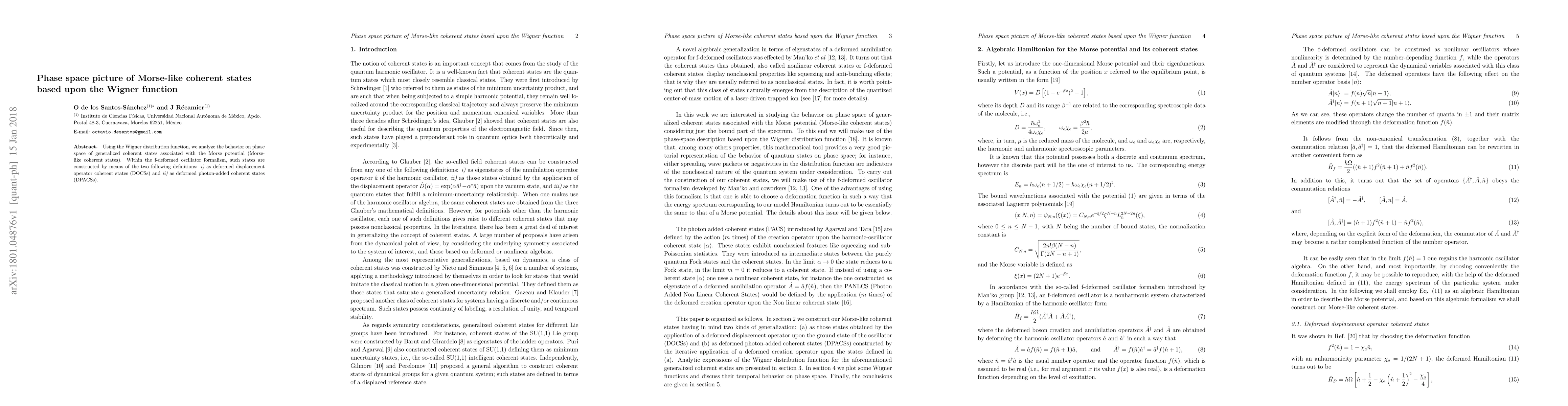 Using the Wigner distribution function, we analyze the behavior on phase space of generalized coherent states associated with the Morse potential (Morse-like coherent states). Within the f-deformed oscillator formalism, such states are constructed by means of the two following definitions: {\it i)} as deformed displacement operator coherent states (DOCSs) and {\it ii)} as deformed photon-added coherent states (DPACSs).
