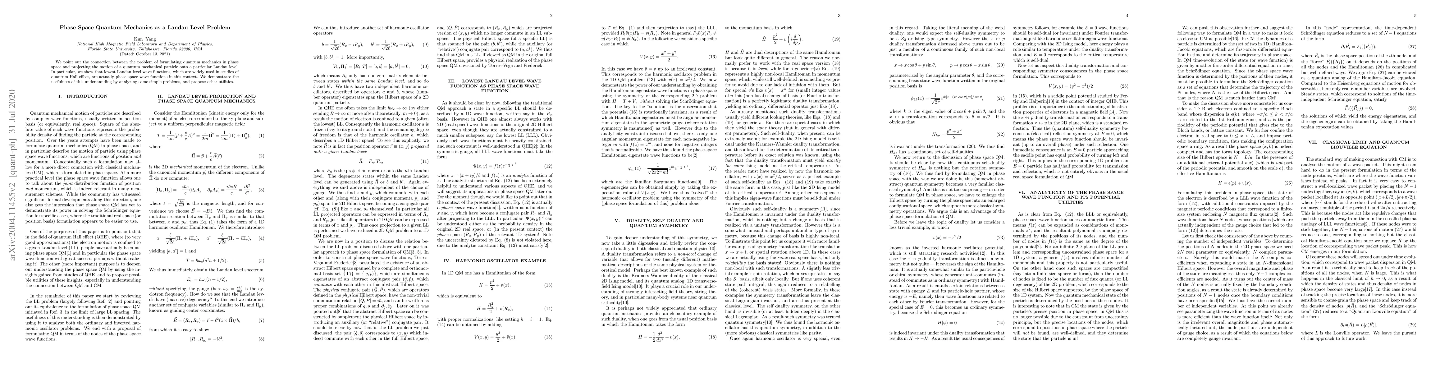 This paper establishes a connection between phase space quantum mechanics and the projection of quantum particle motion onto Landau levels, showing that lowest Landau level wave functions are equivalent to phase space wave functions, and explores their utility in simple quantum problems.