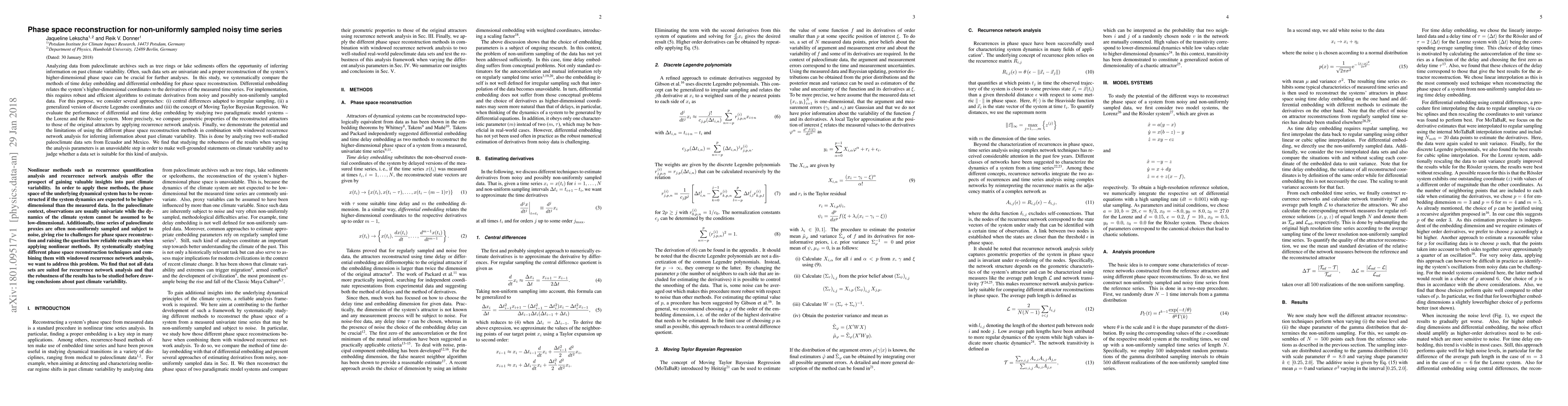 This paper investigates methods for reconstructing the phase space of non-uniformly sampled, noisy time series, comparing time delay and differential embedding techniques. It evaluates these methods using recurrence network analysis on model systems and paleoclimate data, highlighting the importance of parameter robustness for reliable climate variability inference.