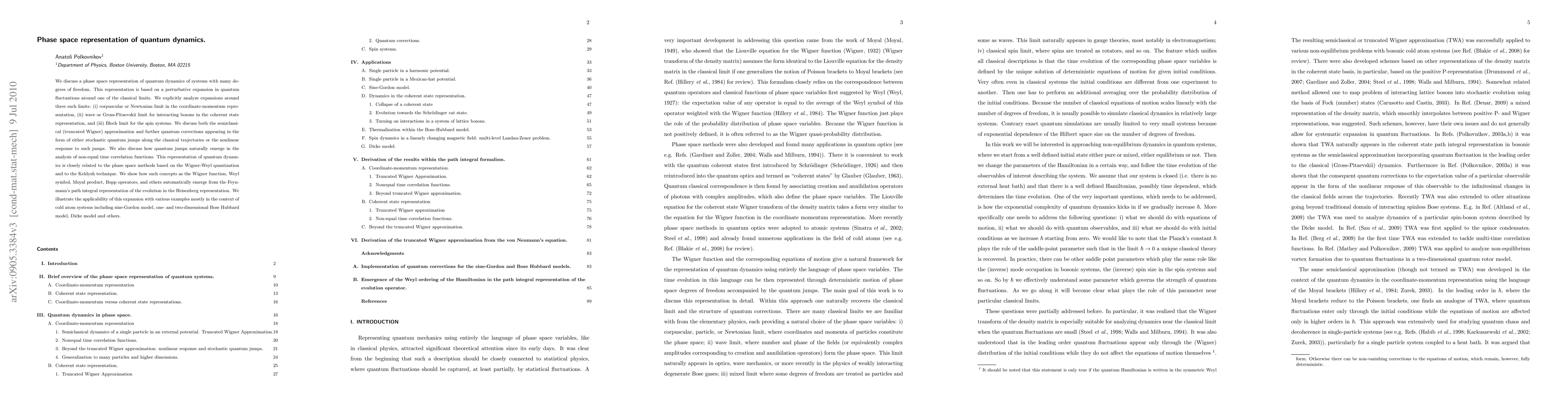 This paper presents a phase space representation of quantum dynamics for systems with many degrees of freedom, exploring perturbative expansions around classical limits and analyzing quantum corrections, including stochastic jumps and nonlinear responses. It connects these concepts to the Wigner-Weyl quantization and the Keldysh technique, demonstrating their utility through examples in cold atom systems.