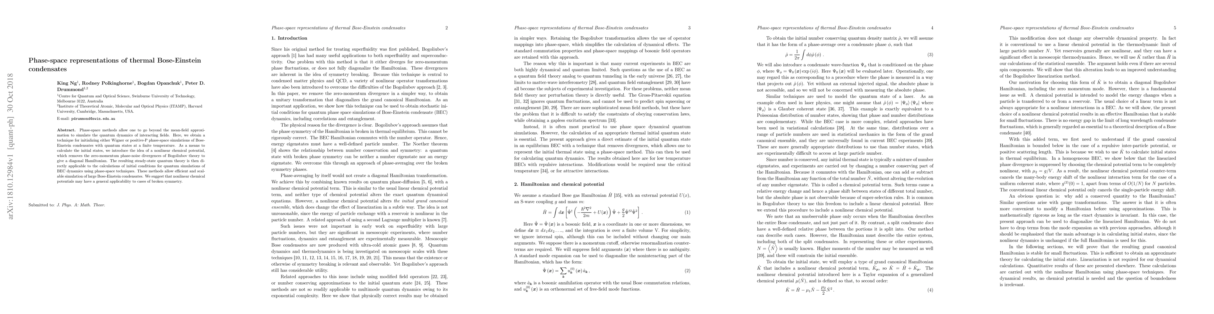 Phase-space methods allow one to go beyond the mean-field approximation to simulate the quantum dynamics of interacting fields. Here, we obtain a technique for initializing either Wigner or positive-P phase-space simulations of Bose-Einstein condensates with quantum states at a finite temperature. As a means to calculate the initial states, we introduce the idea of a nonlinear chemical potential, which removes the zero-momentum phase-noise divergences of Bogoliubov theory to give a diagonal Hamiltonian. The resulting steady-state quantum theory is then directly applicable to the calculations of initial conditions for quantum simulations of BEC dynamics using phase-space techniques. These methods allow efficient and scalable simulation of large Bose-Einstein condensates. We suggest that nonlinear chemical potentials may have a general applicability to cases of broken symmetry.