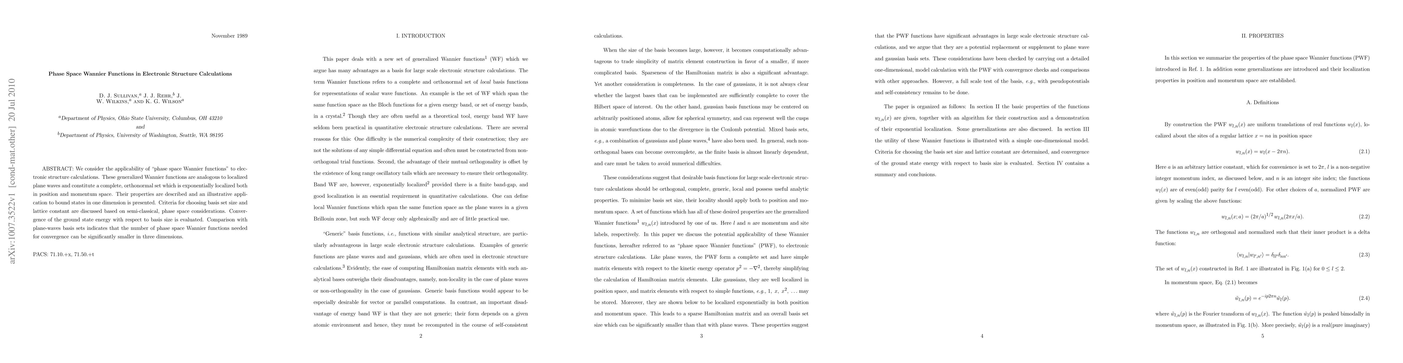 This paper explores the use of phase space Wannier functions for electronic structure calculations, showing they provide a complete, orthonormal set that is exponentially localized in both position and momentum space. The study demonstrates their efficiency in bound state calculations and compares their convergence with plane-wave basis sets, finding that fewer functions are needed for convergence in three dimensions.