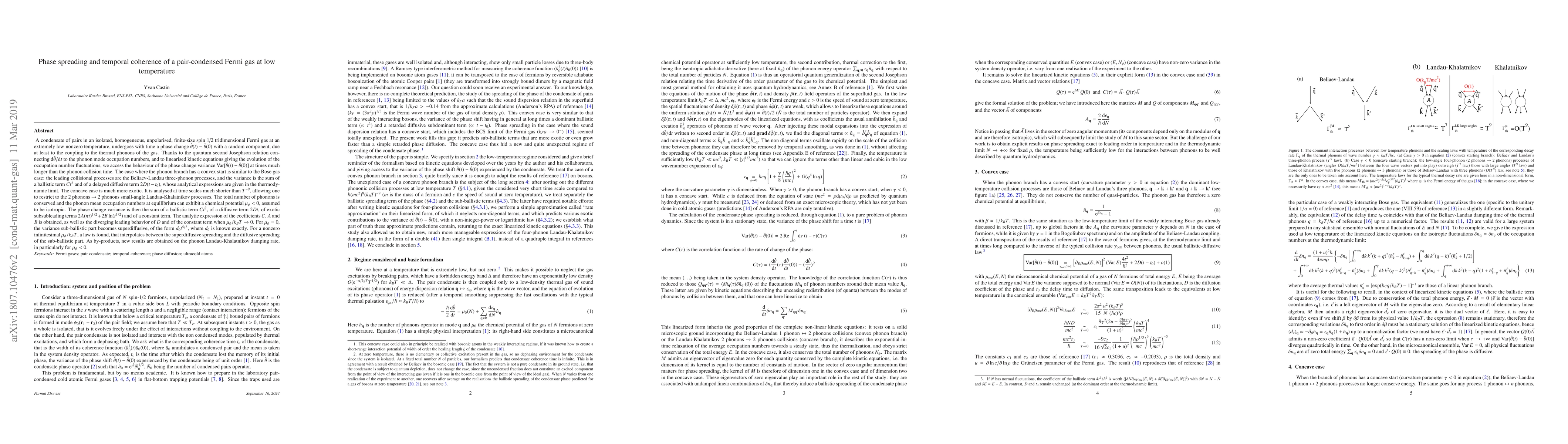 A condensate of pairs in an isolated, homogeneous, unpolarised, finite-size spin 1/2 Fermi gas at low nonzero temperature T, undergoes with time a phase change with a random component, due to coupling to the gas thermal phonons. With the quantum second Josephson relation relating the derivative of the condensate phase operator to the phonon occupation numbers, and linearised kinetic equations giving the evolution of occupation number fluctuations, we access the behaviour of the phase change variance at times much longer than the phonon collision time. The case of a convex phonon branch is similar to the Bose gas case: the leading collisional processes are the Beliaev-Landau 3-phonons processes, and the variance is the sum of a ballistic term and of a delayed diffusive term, whose analytical expressions are given in the thermodynamic limit. The concave case is more exotic. It is analysed at time scales $T^{-9}$, allowing one to restrict to 2 phonons $\rightarrow$ 2 phonons small-angle Landau-Khalatnikov processes. The total number of phonons is conserved and the phonon mean occupation numbers at equilibrium can exhibit a negative chemical potential, assumed isotropic. The phase change variance is then the sum of a ballistic term, of a diffusive term, of exotic subsubleading terms and of a constant term. The analytic expression of some of the corresponding coefficients is obtained, as well as the diverging leading behavior of the other ones when the phonon chemical potential tends to 0. When this chemical potential is 0, the variance sub-ballistic part becomes superdiffusive, with an exponent 5/3 and an exactly-known coefficient. For a nonzero infinitesimal phonon chemical potential, a law is found, interpolating between superdiffusive and diffusive phase spreading. Also new results are obtained on the phonon Landau-Khalatnikov damping rate, in particular at negative phonon chemical potential.