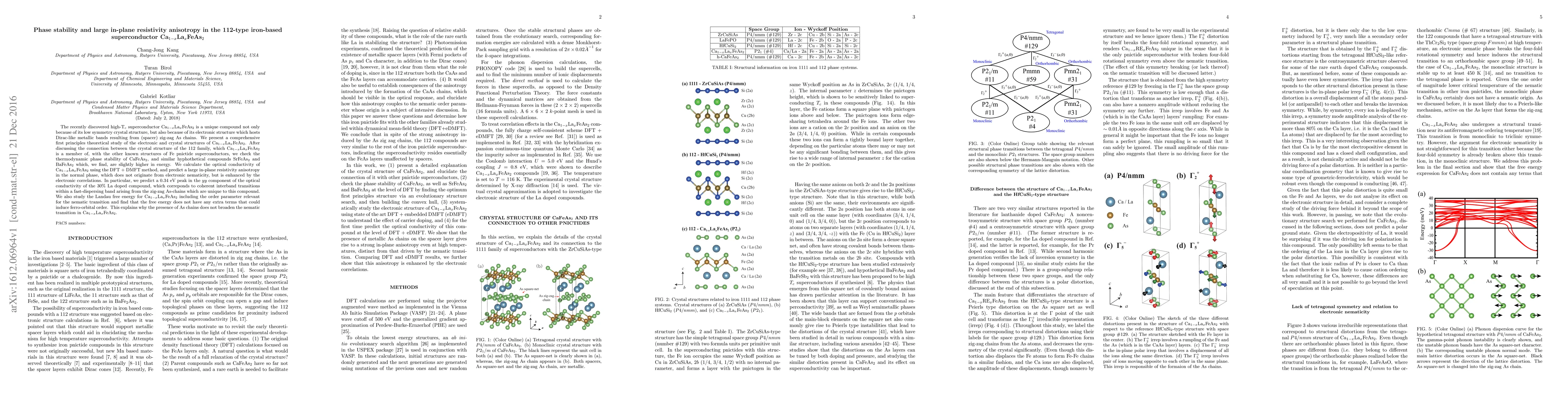 The recently discovered high-T$_c$ superconductor Ca$_{1-x}$La$_{x}$FeAs$_{2}$ is a unique compound not only because of its low symmetry crystal structure, but also because of its electronic structure which hosts Dirac-like metallic bands resulting from (spacer) zig-zag As chains. We present a comprehensive first principles theoretical study of the electronic and crystal structures of Ca$_{1-x}$La$_{x}$FeAs$_{2}$. After discussing the connection between the crystal structure of the 112 family, which Ca$_{1-x}$La$_{x}$FeAs$_{2}$ is a member of, with the other known structures of Fe pnictide superconductors, we check the thermodynamic phase stability of CaFeAs$_{2}$, and similar hyphothetical compounds SrFeAs$_{2}$ and BaFeAs$_{2}$ which, we find, are slightly higher in energy. We calculate the optical conductivity of Ca$_{1-x}$La$_{x}$FeAs$_{2}$ using the DFT + DMFT method, and predict a large in-plane resistivity anisotropy in the normal phase, which does not originate from electronic nematicity, but is enhanced by the electronic correlations. In particular, we predict a 0.34 eV peak in the $yy$ component of the optical conductivity of the 30\% La doped compound, which correponds to coherent interband transitions within a fast-dispersing band arising from the zig-zag As-chains which are unique to this compound. We also study the Landau free energy for Ca$_{1-x}$La$_{x}$FeAs$_{2}$ including the order parameter relevant for the nematic transition and find that the free energy does not have any extra terms that could induce ferro-orbital order. This explains why the presence of As chains does not broaden the nematic transition in Ca$_{1-x}$La$_{x}$FeAs$_{2}$.